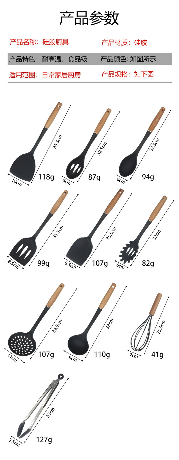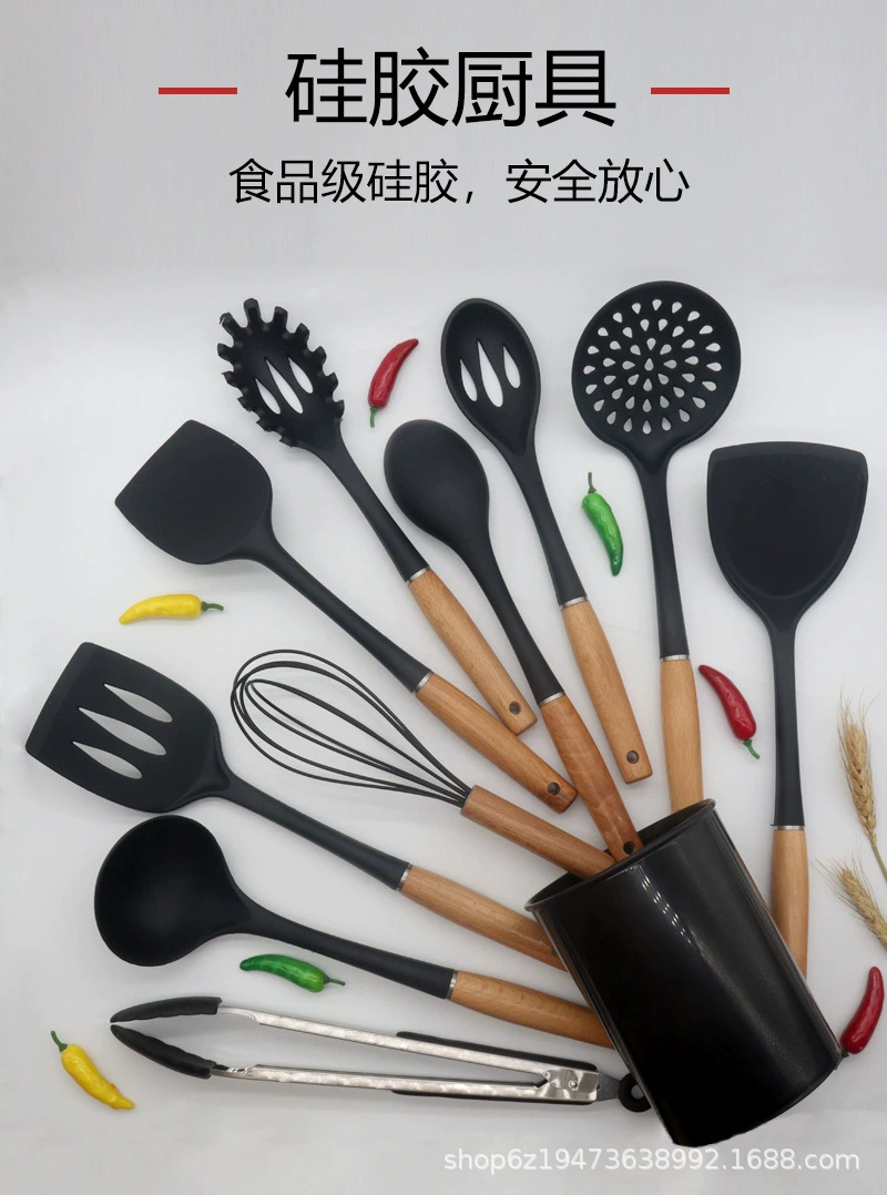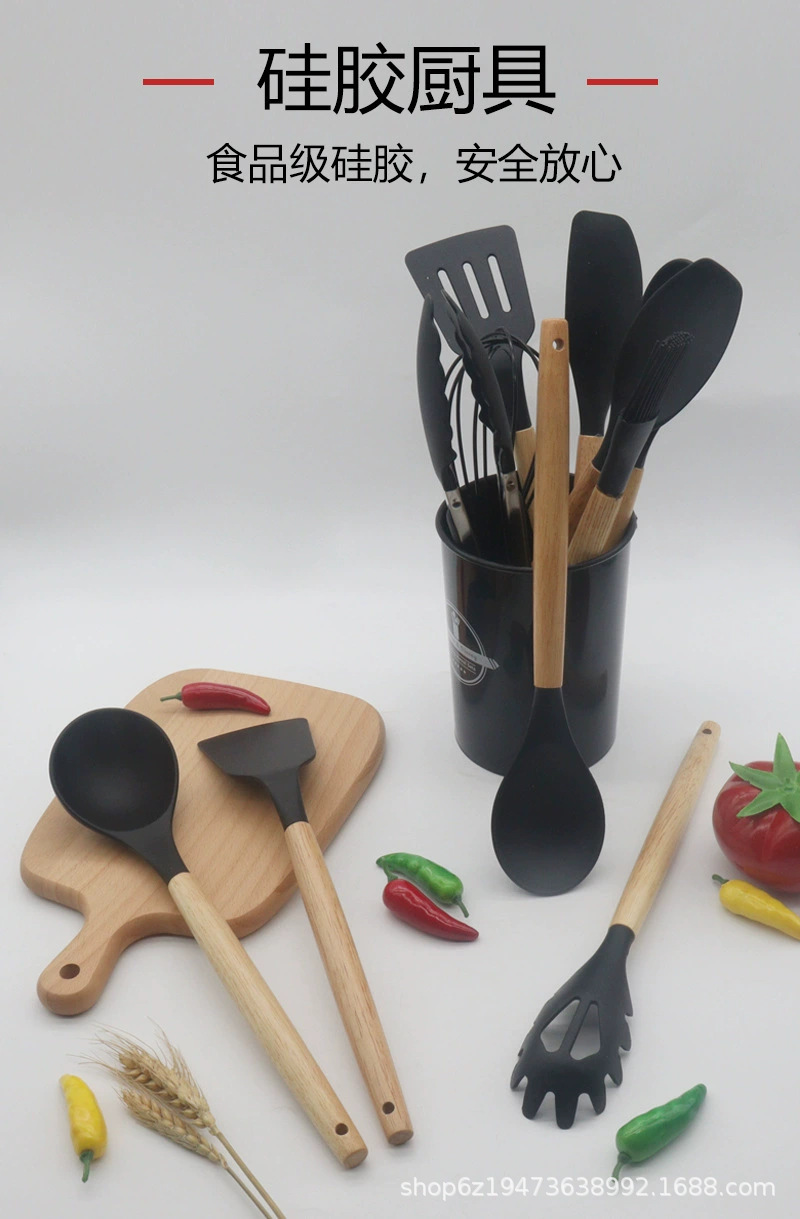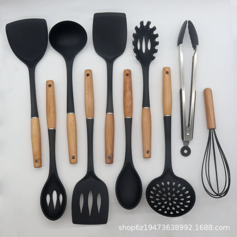Juego de utensilios de cocina con mango de madera Juego de utensilios de cocina de silicona Juego de 9 piezas Juego de cuchara y pala Olla antiadherente Juego de utensilios de cocina de silicona