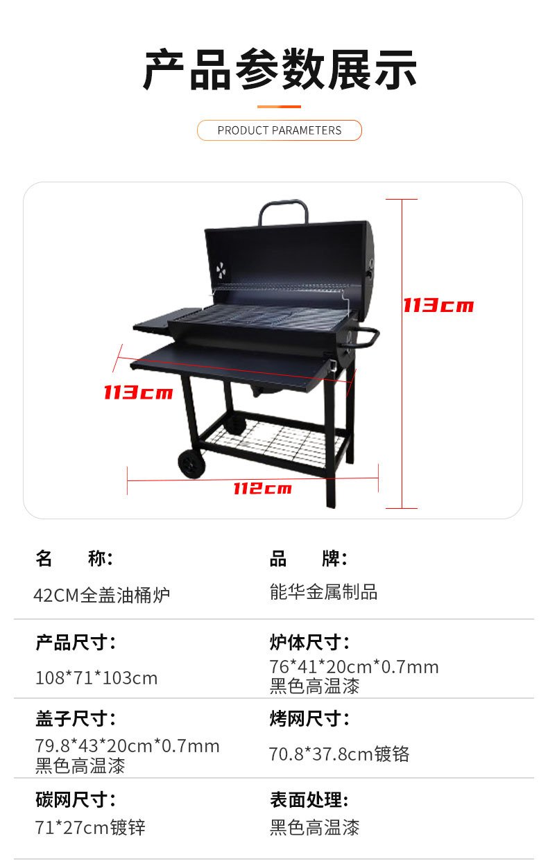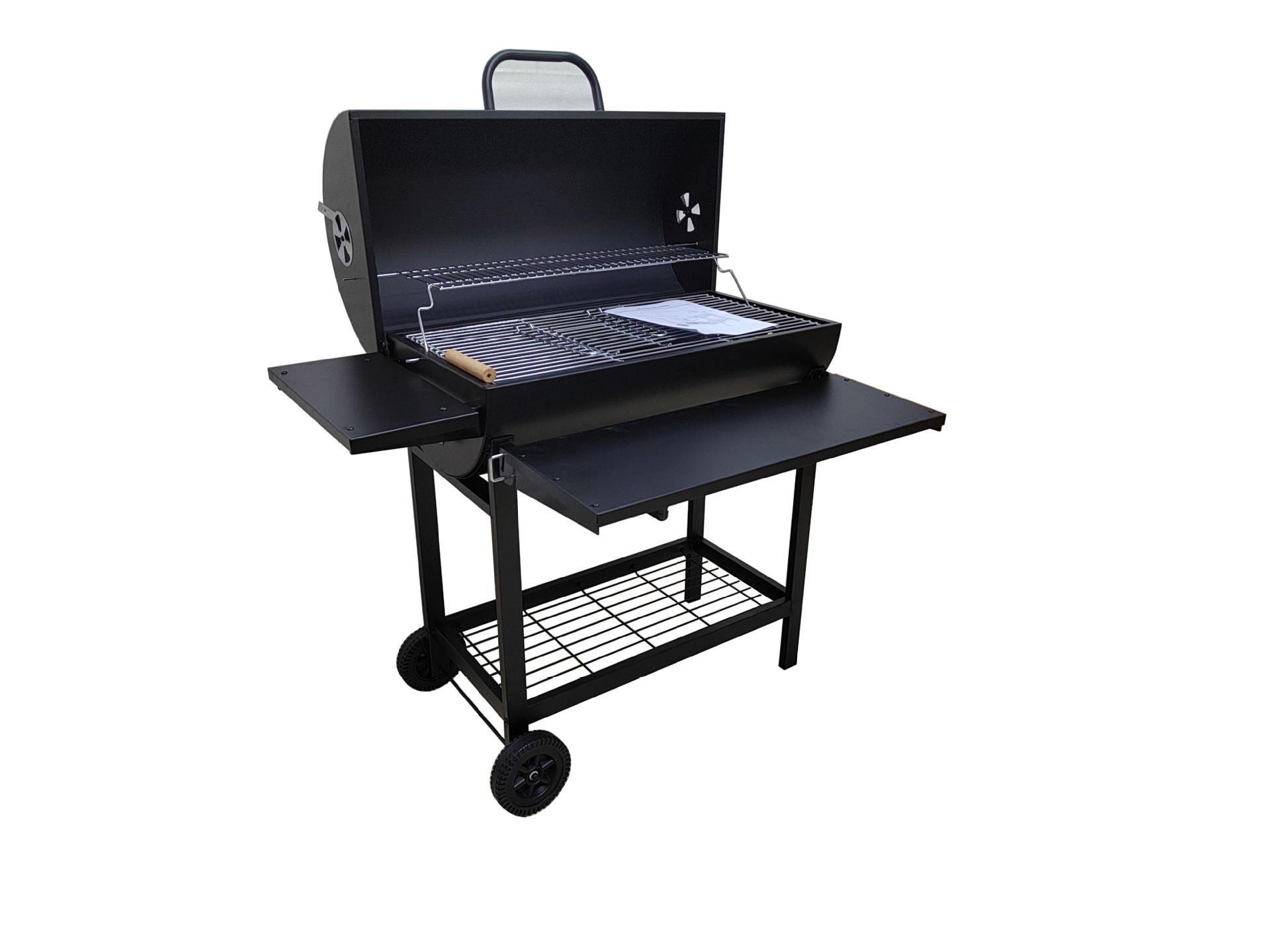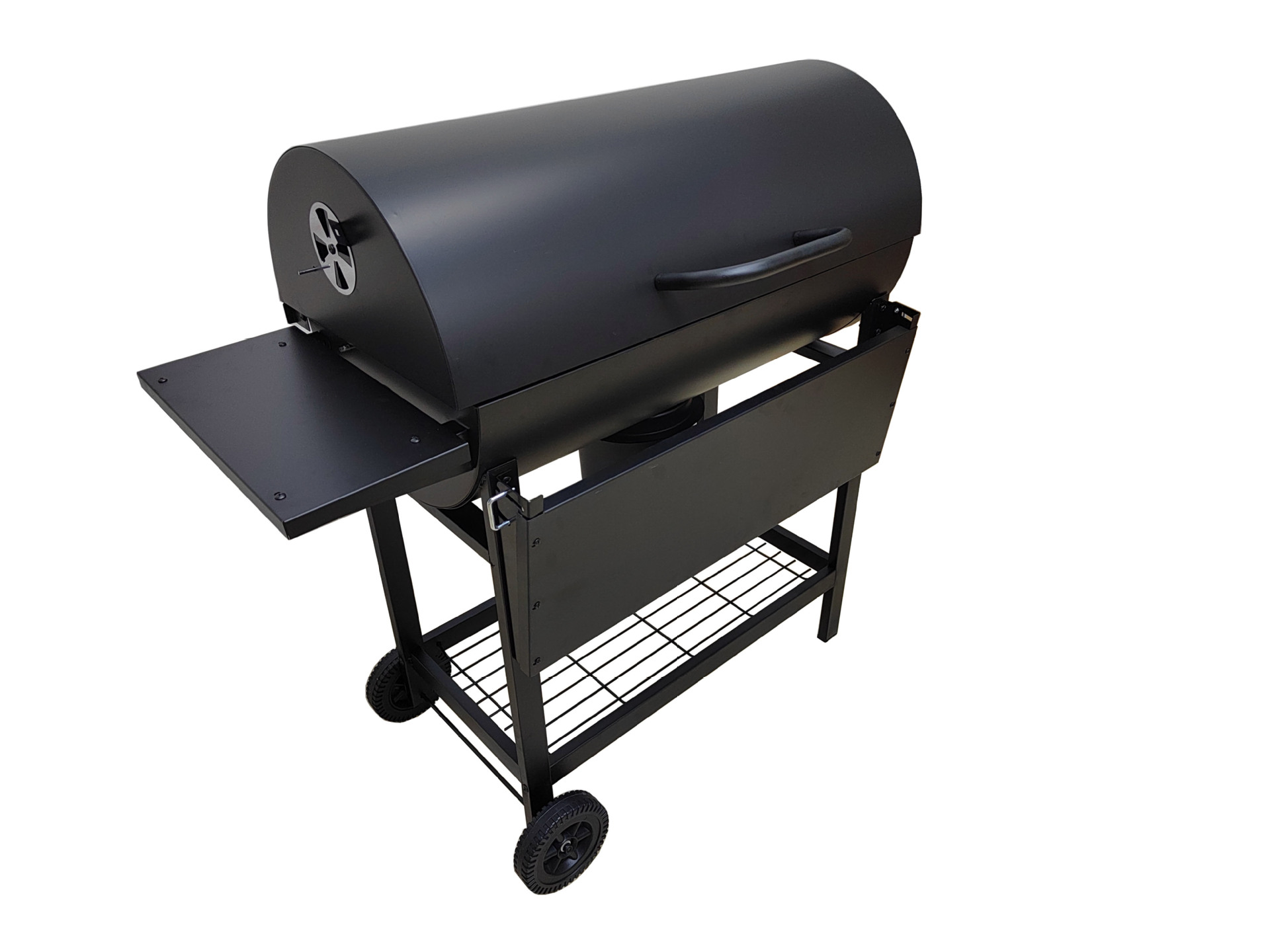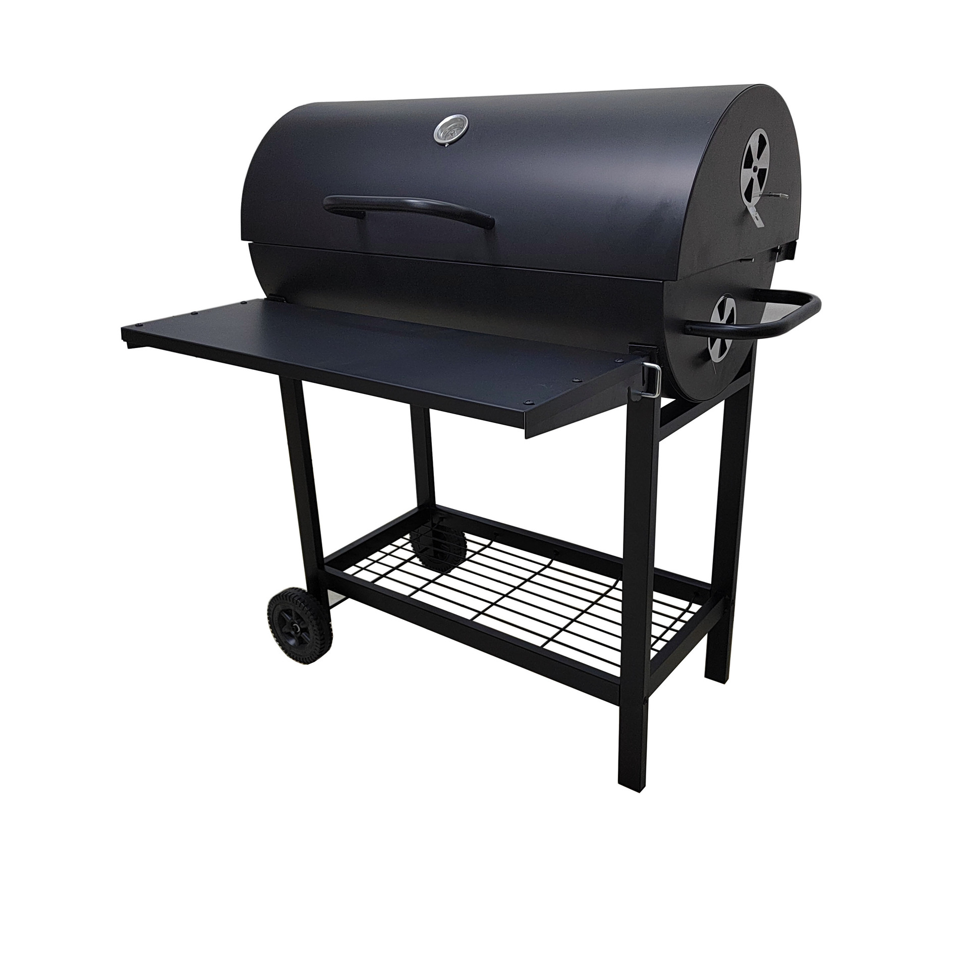 El fabricante suministra una parrilla para barbacoa de barril de aceite completamente cerrada de 42 cm de diámetro con ruedas y un panel frontal plegable.