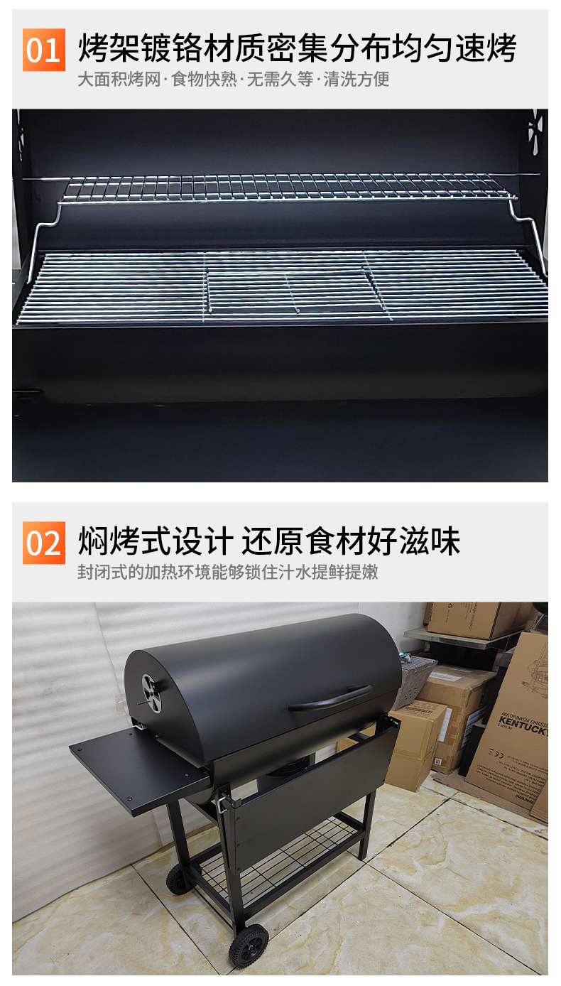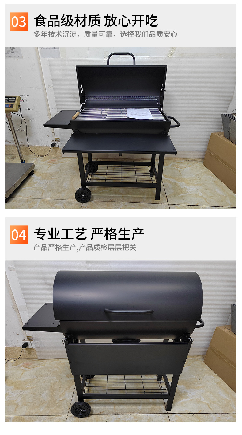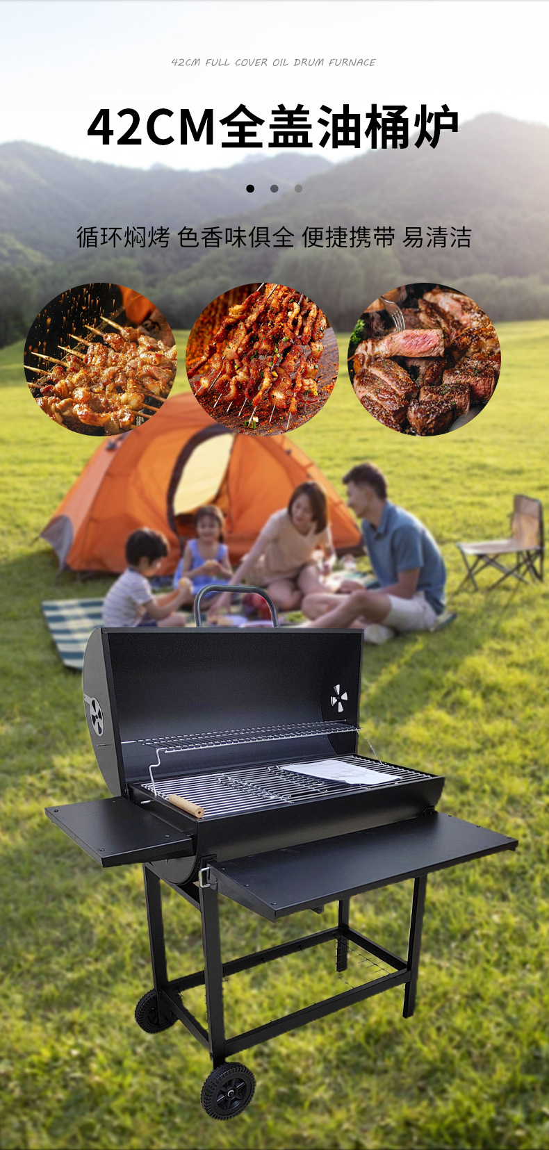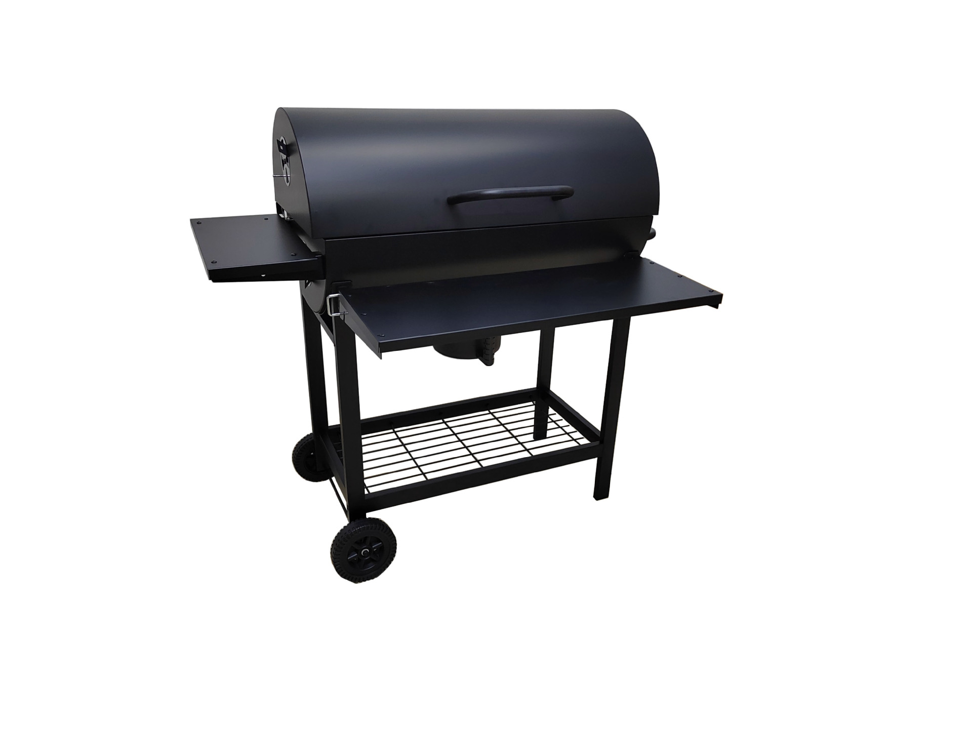 El fabricante suministra una parrilla para barbacoa de barril de aceite completamente cerrada de 42 cm de diámetro con ruedas y un panel frontal plegable.