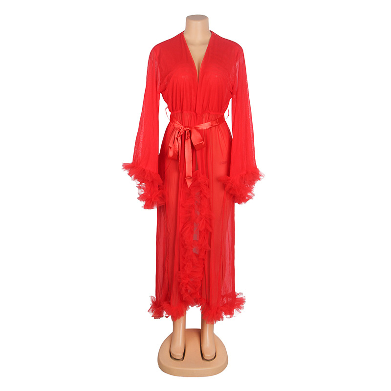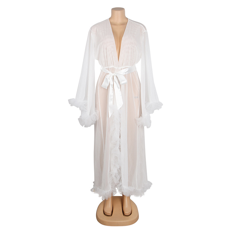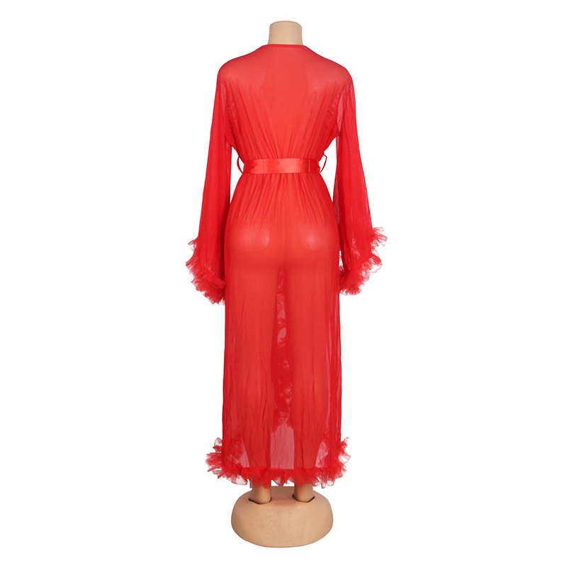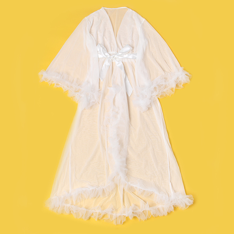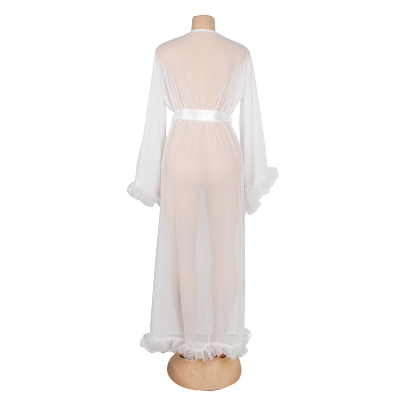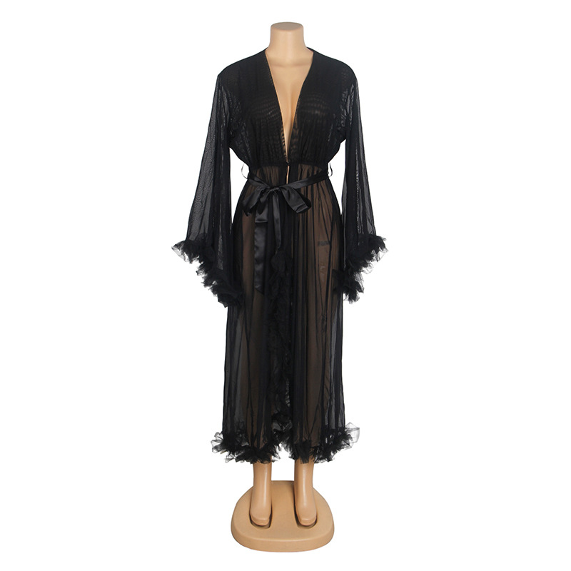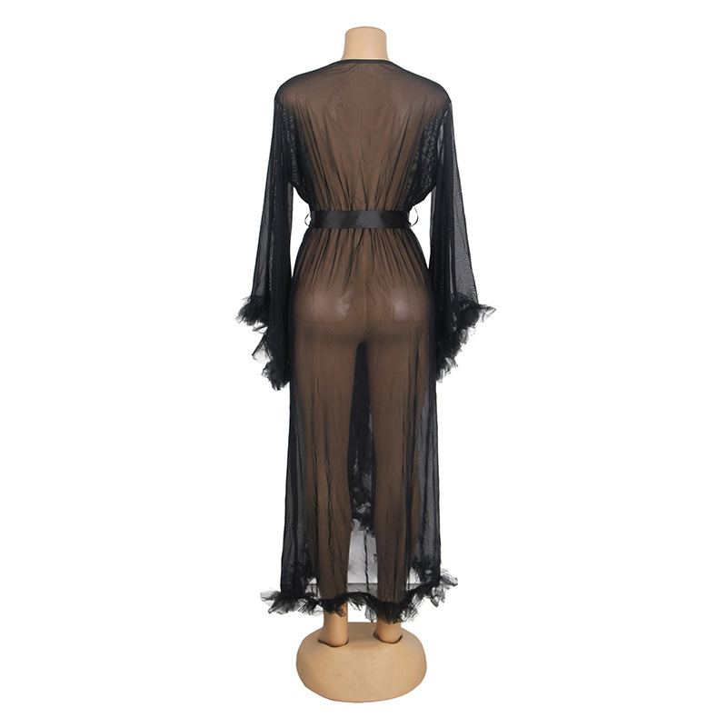 Comercio exterior transfronterizo al por mayor más el tamaño de la ropa interior sexy de las mujeres de malla ver-a través de manga larga cardigan camisón sexy conjunto de tres piezas