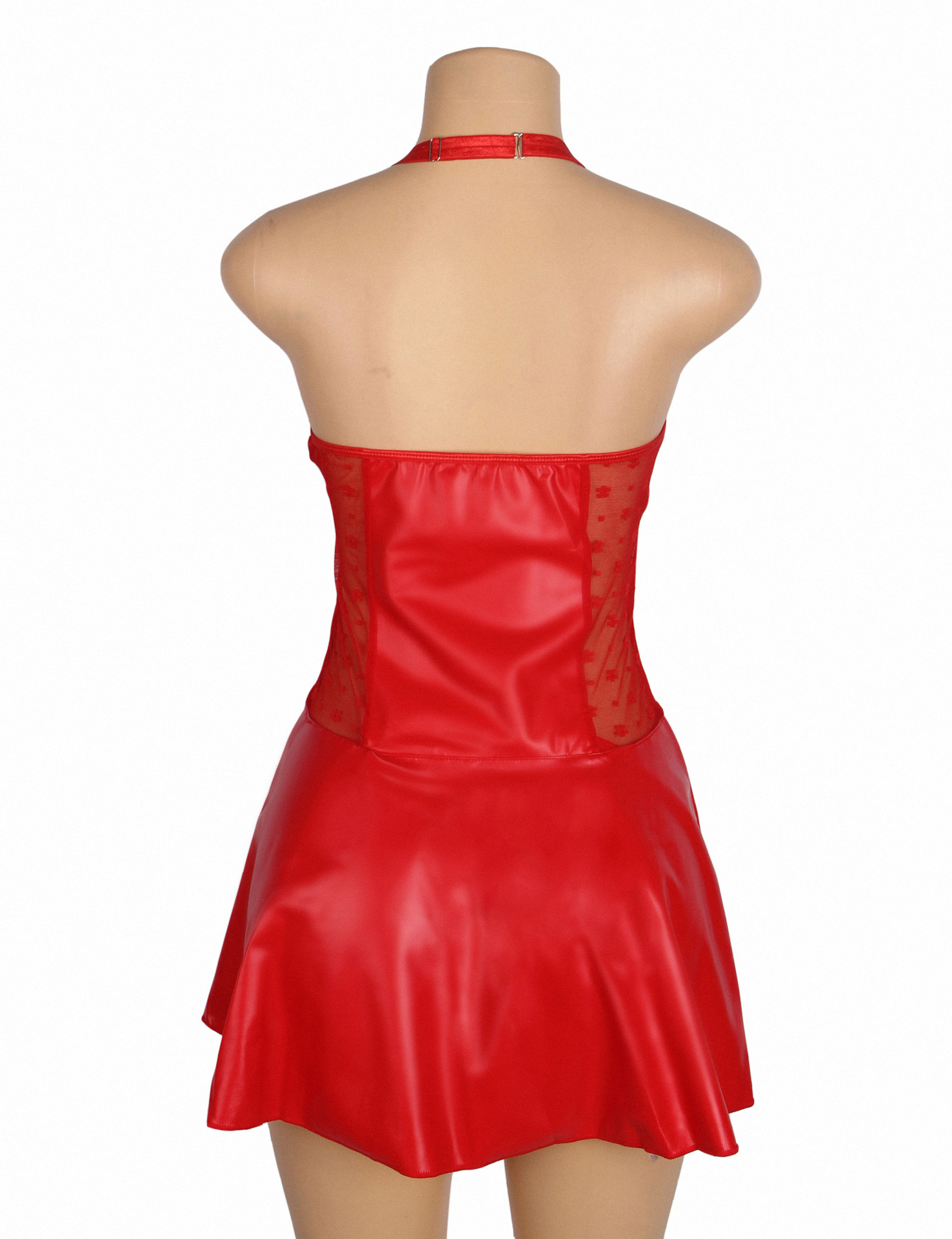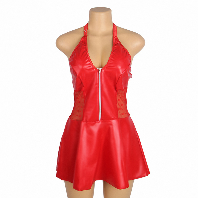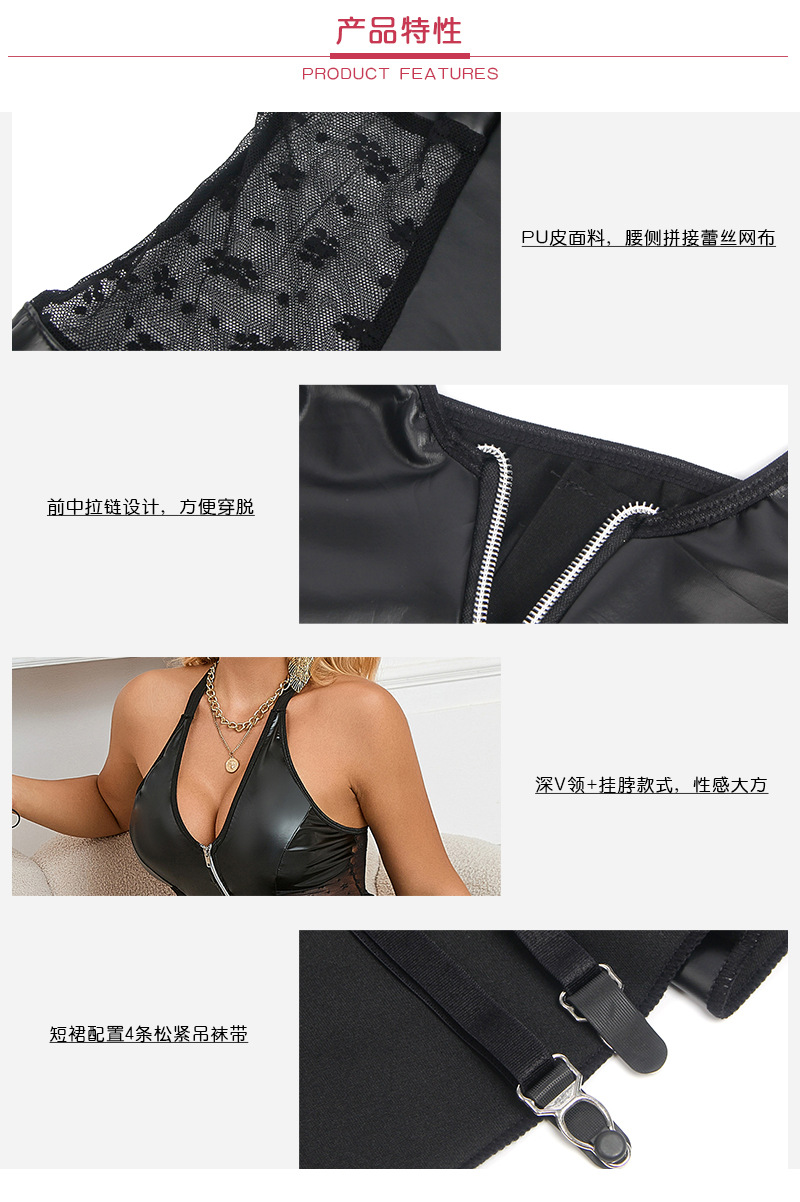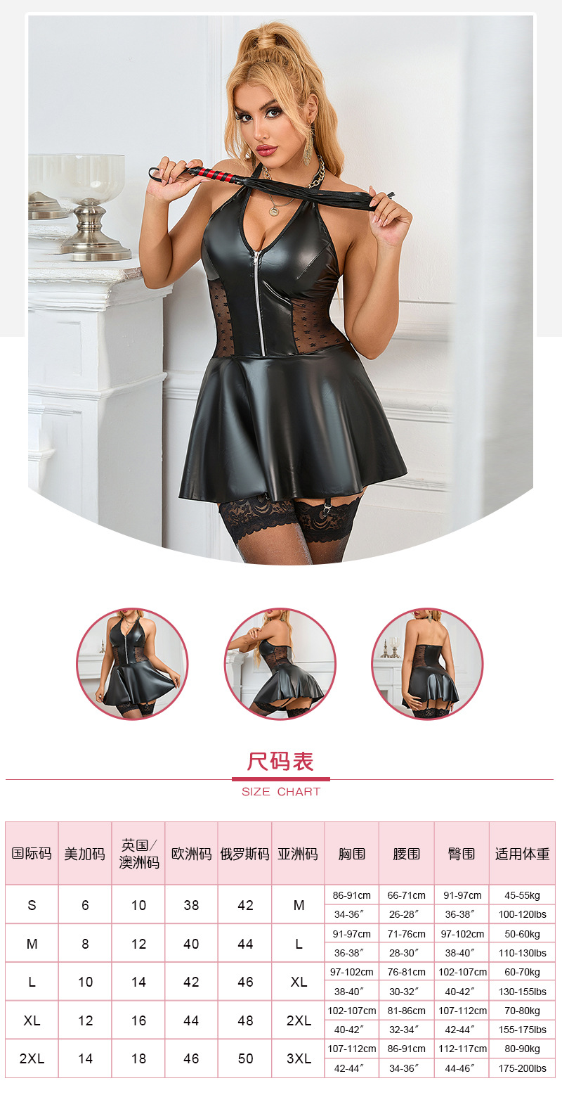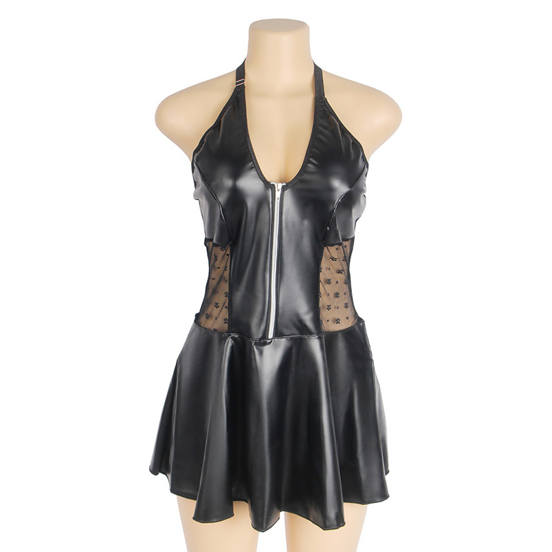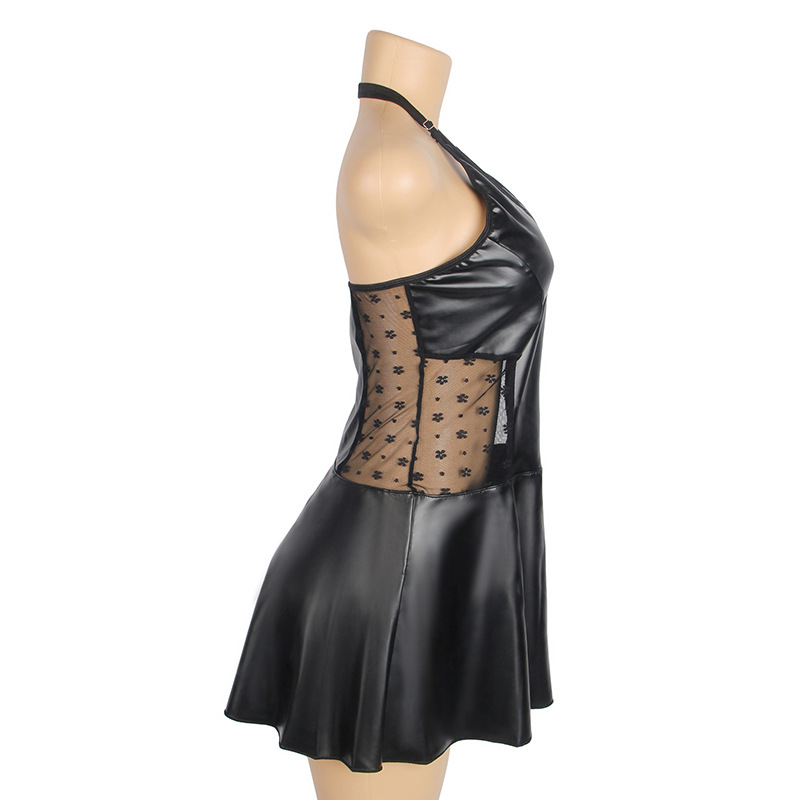 Ropa interior sexy de talla grande europea y americana para mujer, cuello halter sexy, falda de cuero PU, encaje, tentación caliente, tirantes, una pieza, transfronterizo