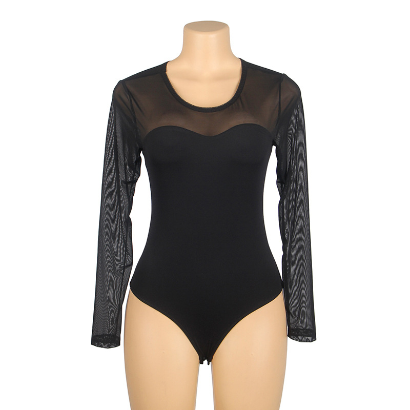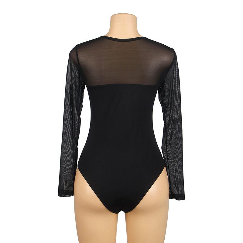 Europa y América sexy ver a través de malla de una sola pieza de manga larga superior de las mujeres de comercio exterior más tamaño apretado mono de extremo abierto se puede usar fuera