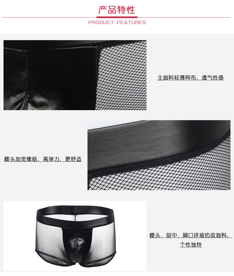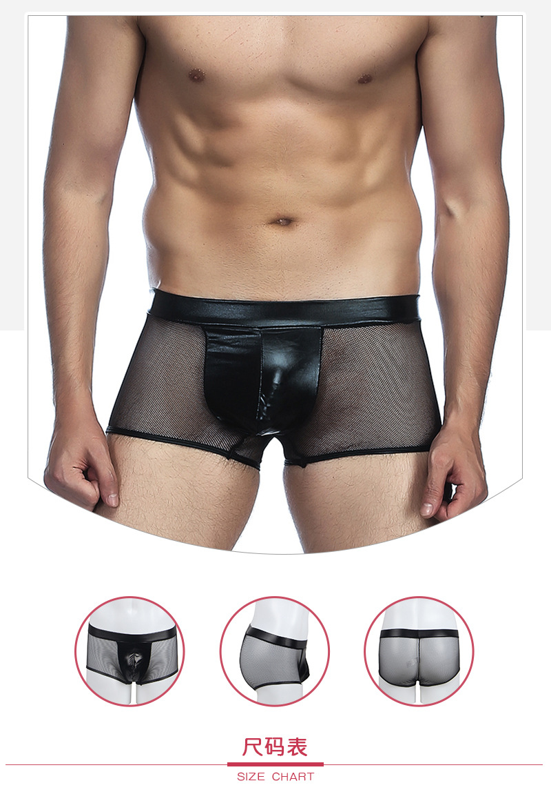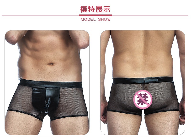 Amazon hombre grande sexy pantalones íntimos negros de malla transparente de ángulo plano hueco pantalones cortos de piel transparente