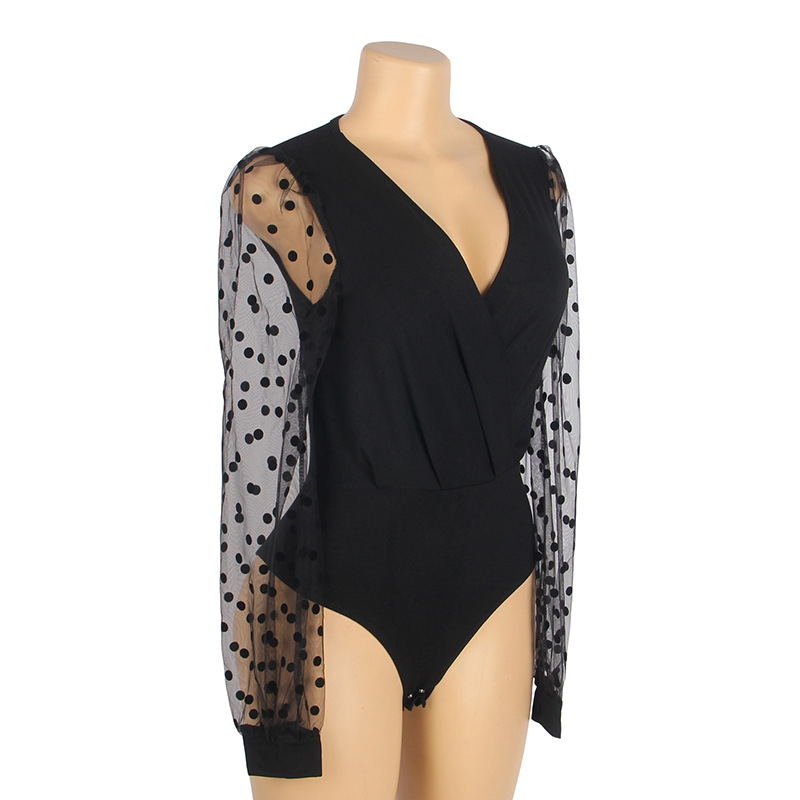 Spot primavera, otoño y invierno comercio exterior ropa de mujer con negro sexy profundo punto de onda V malla manga larga entrepierna abierta combinación