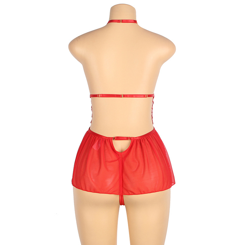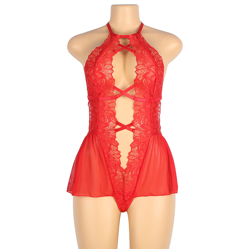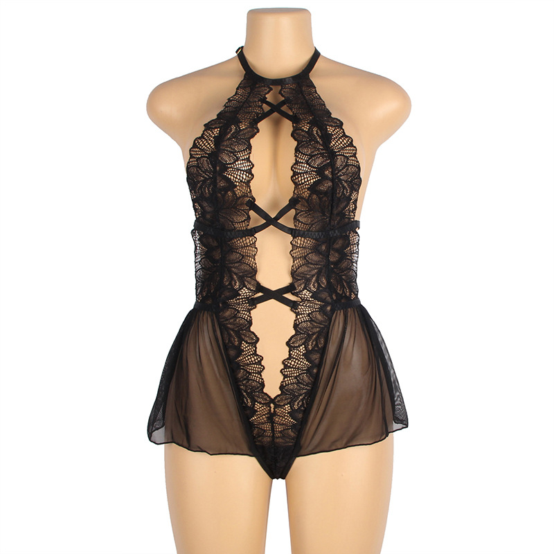Europeo y americano popular más tamaño sexy mono gordo hermana tentación sexy perspectiva encaje hueco backless pijamas camisón