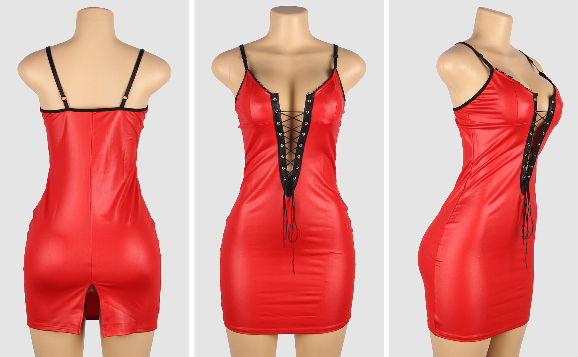 Comercio exterior europeo y americano más tamaño lencería sexy rojo profundo V encaje-arriba imitación cuero sexy Correa camisón al por mayor r81058