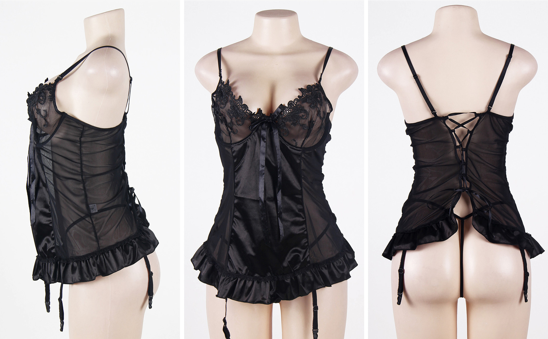 Comercio exterior europeo y americano sexy negro bordado sujetador volantes gancho espalda sexy Correa camisón Amazon al por mayor 7429