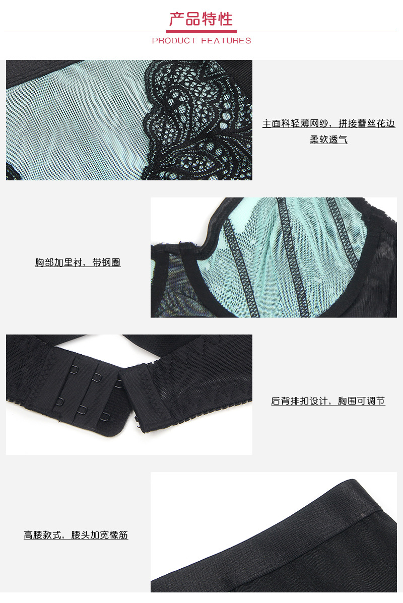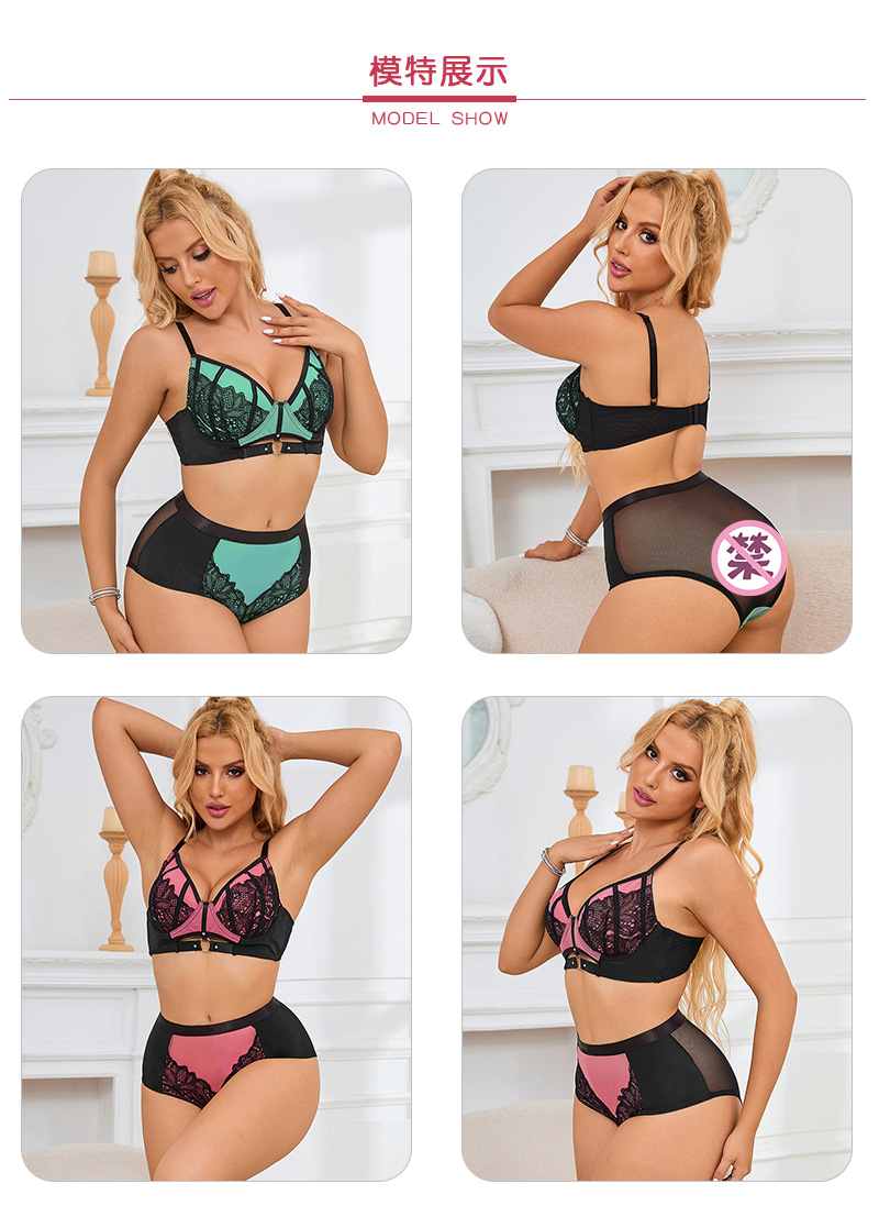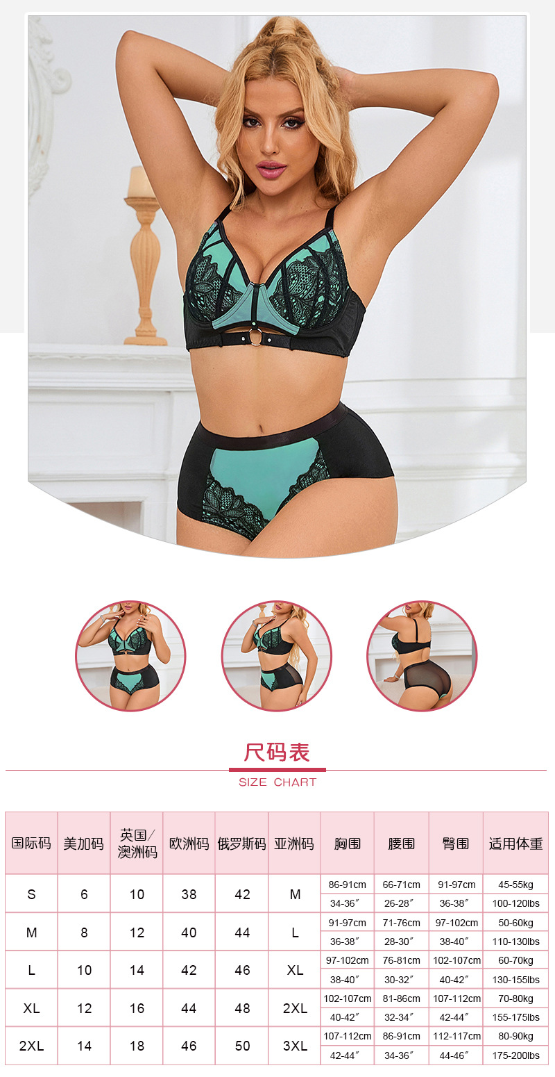 Mujeres europeas y americanas de talla grande traje de ropa interior de tres puntos con anillo de acero sujetador de cintura alta perspectiva ropa interior conjunto de 2 piezas de comercio exterior