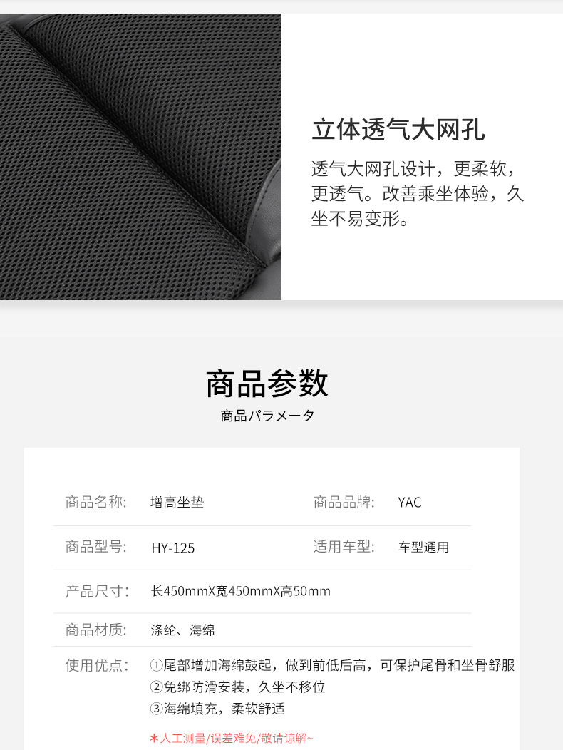 JAPAN YAC cojín de asiento de automóvil colapso de cojín de asiento general de cuatro estaciones elevando la ventilación de aire cojín de conducción principal de automóvil una sola pieza