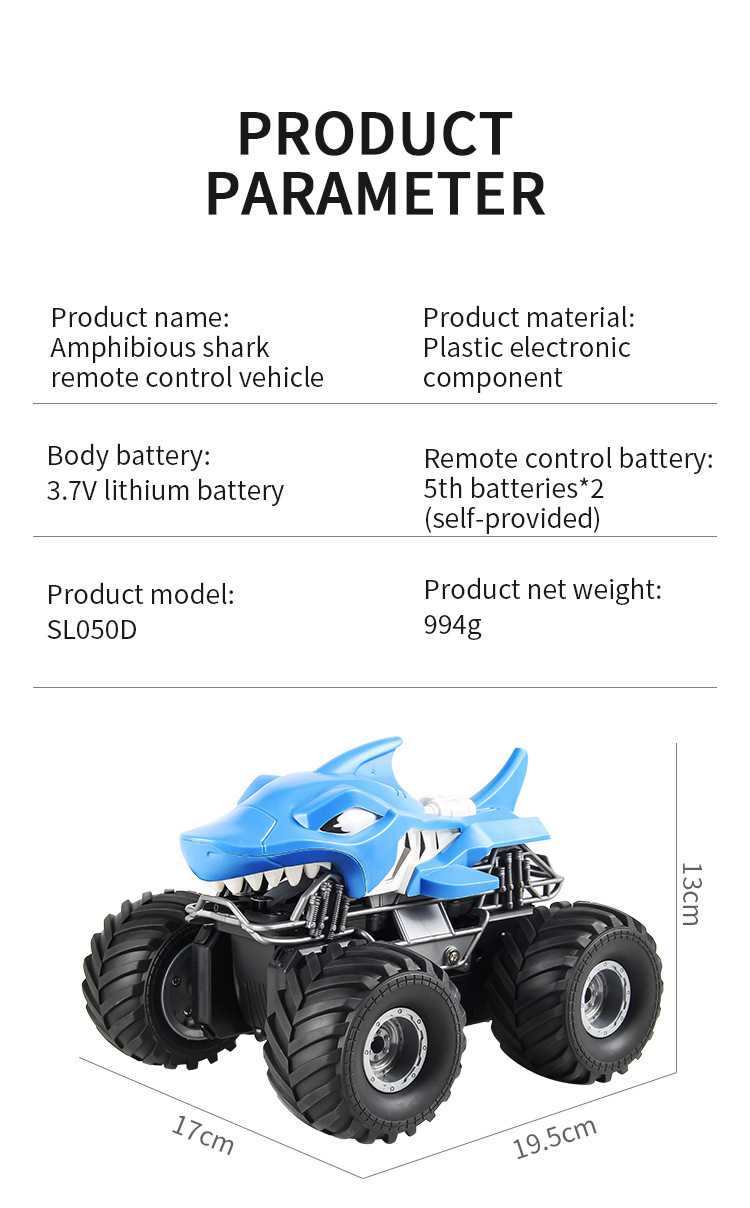 | Colores | SL050D Shark anfibio coche de control remoto-gris 994g,SL050D Shark anfibio coche de control remoto-azul 994g,SL050 Shark anfibio coche de control remoto-gris 994g,SL050 Shark anfibio coche de control remoto-azul 994g,SL051D Shark anfibio coche de control remoto-verde 994g,SL051D Shark anfibio coche de control remoto-marrón 994g,SL051 Shark anfibio coche de control remoto-verde 994g,SL051 Shark anfibio coche de control remoto-marrón 994g |
