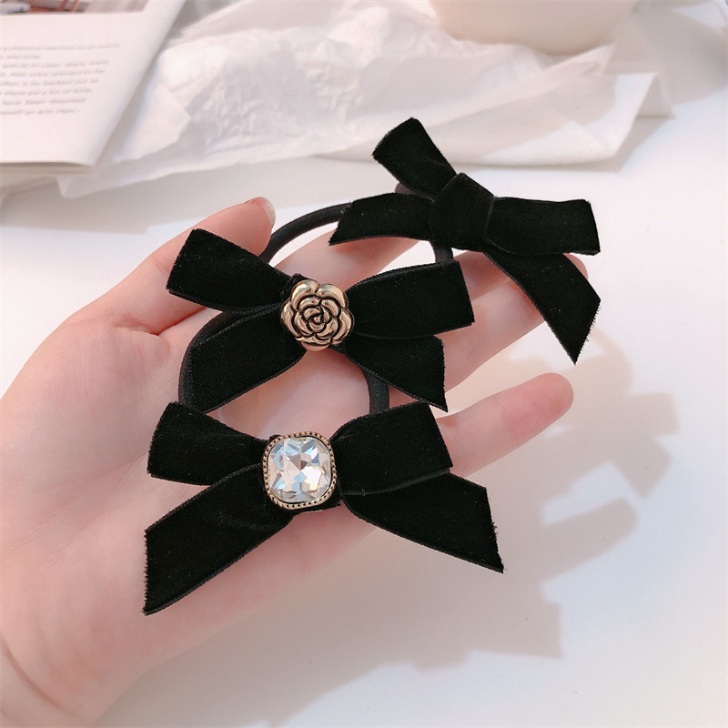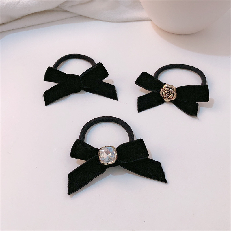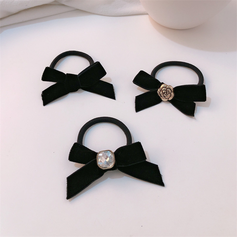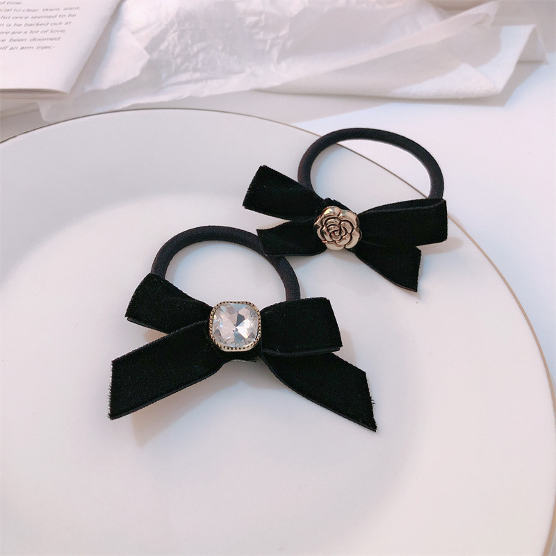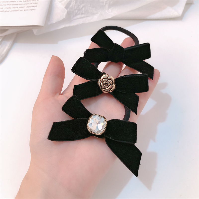 Pequeño anillo de pelo de camelia fragante, lazo de diamantes de imitación, cuerda para la cabeza, temperamento, cuerda para el cabello, simple, negro, todo fósforo, banda de goma para el cabello atado