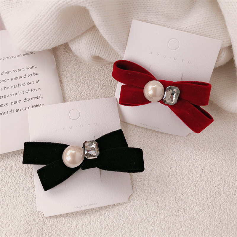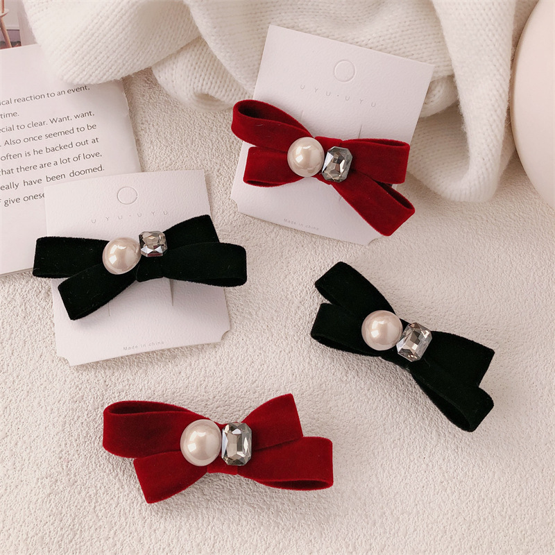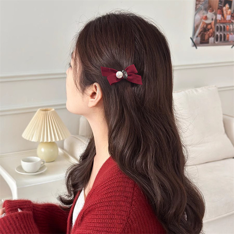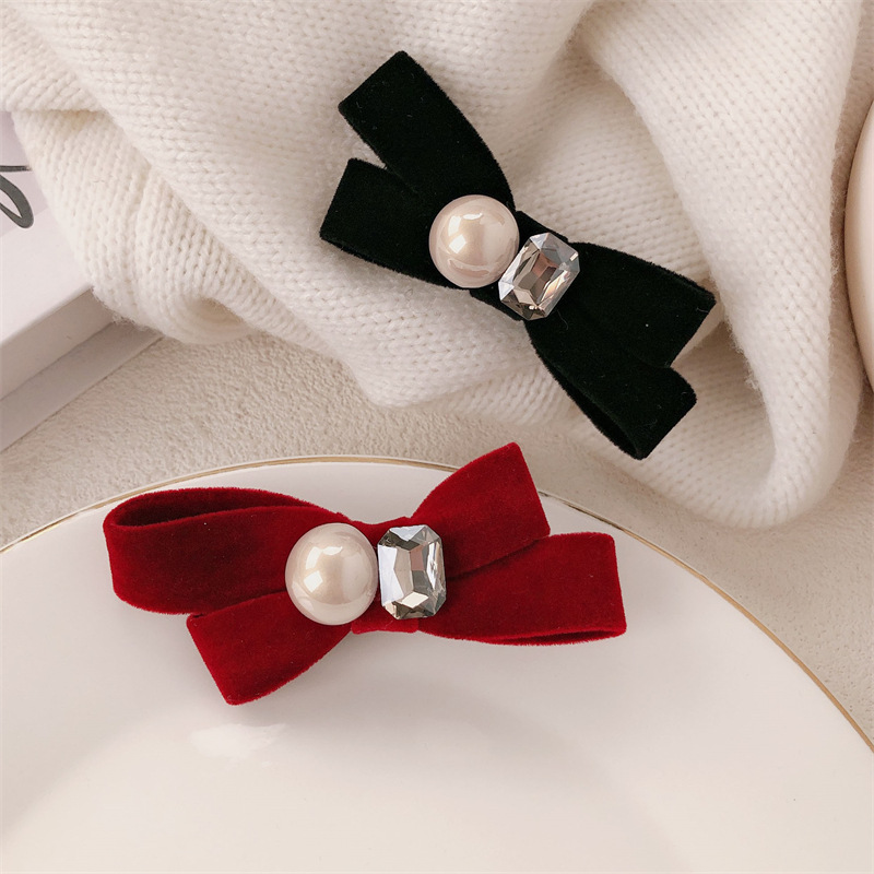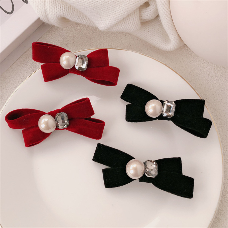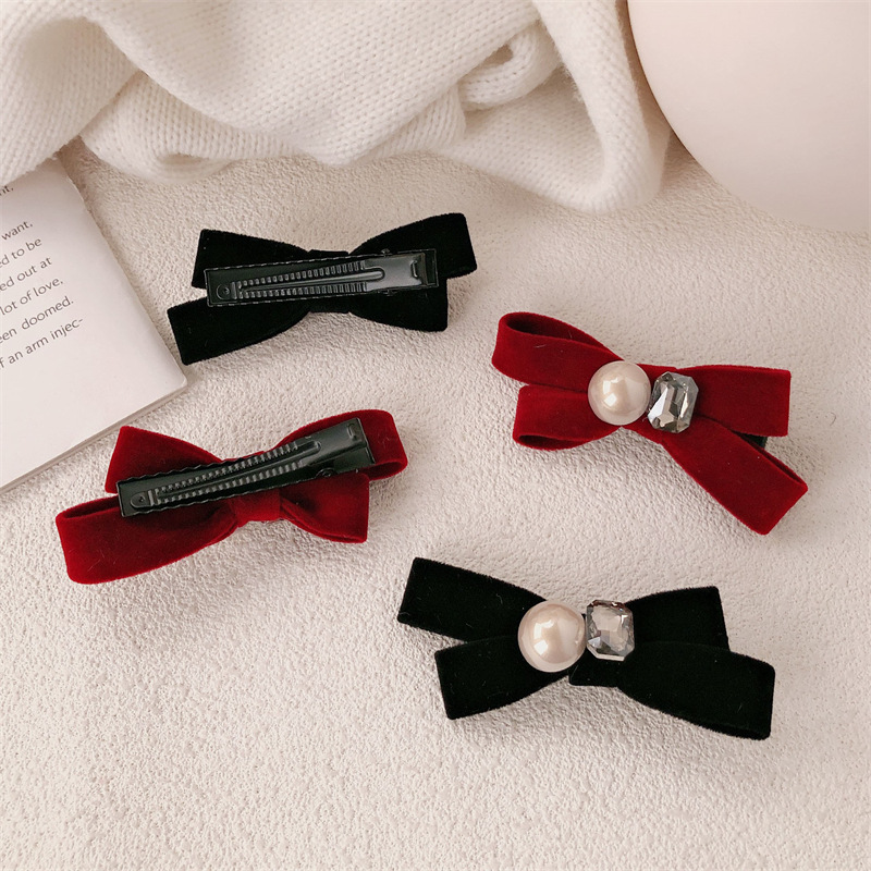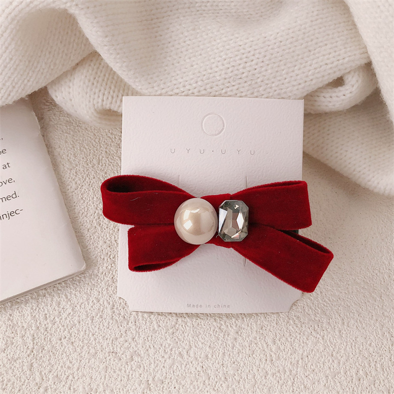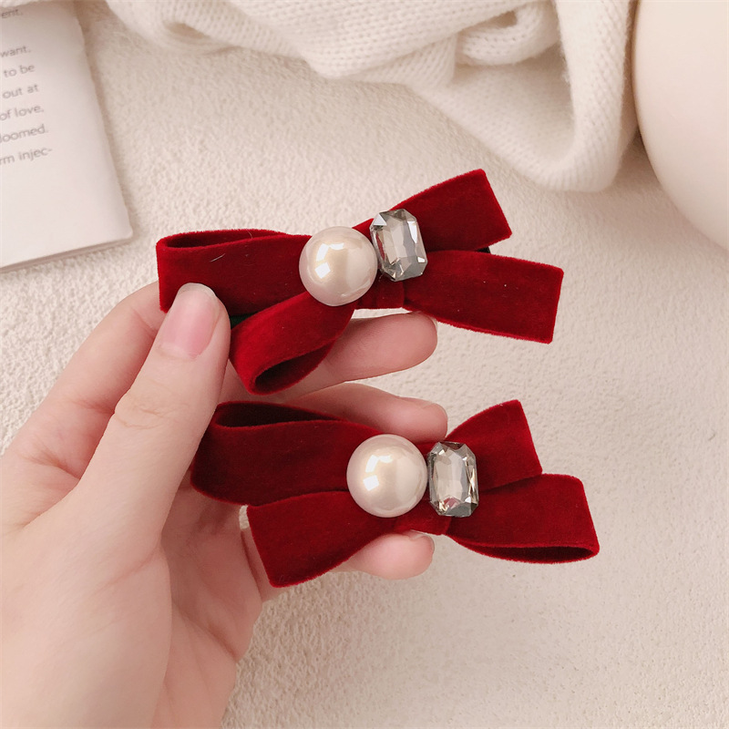 Terciopelo rojo pequeño arco de viento dulce temperamento princesa clips de bordes de alta sensación de diamante de boca de pato clips de cabello