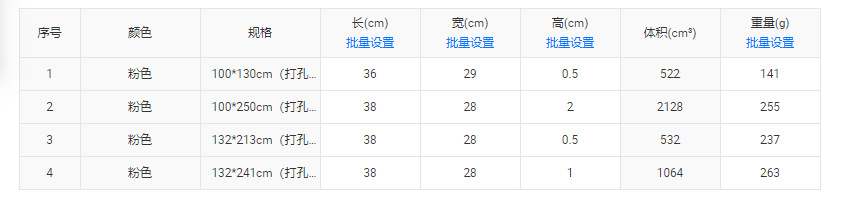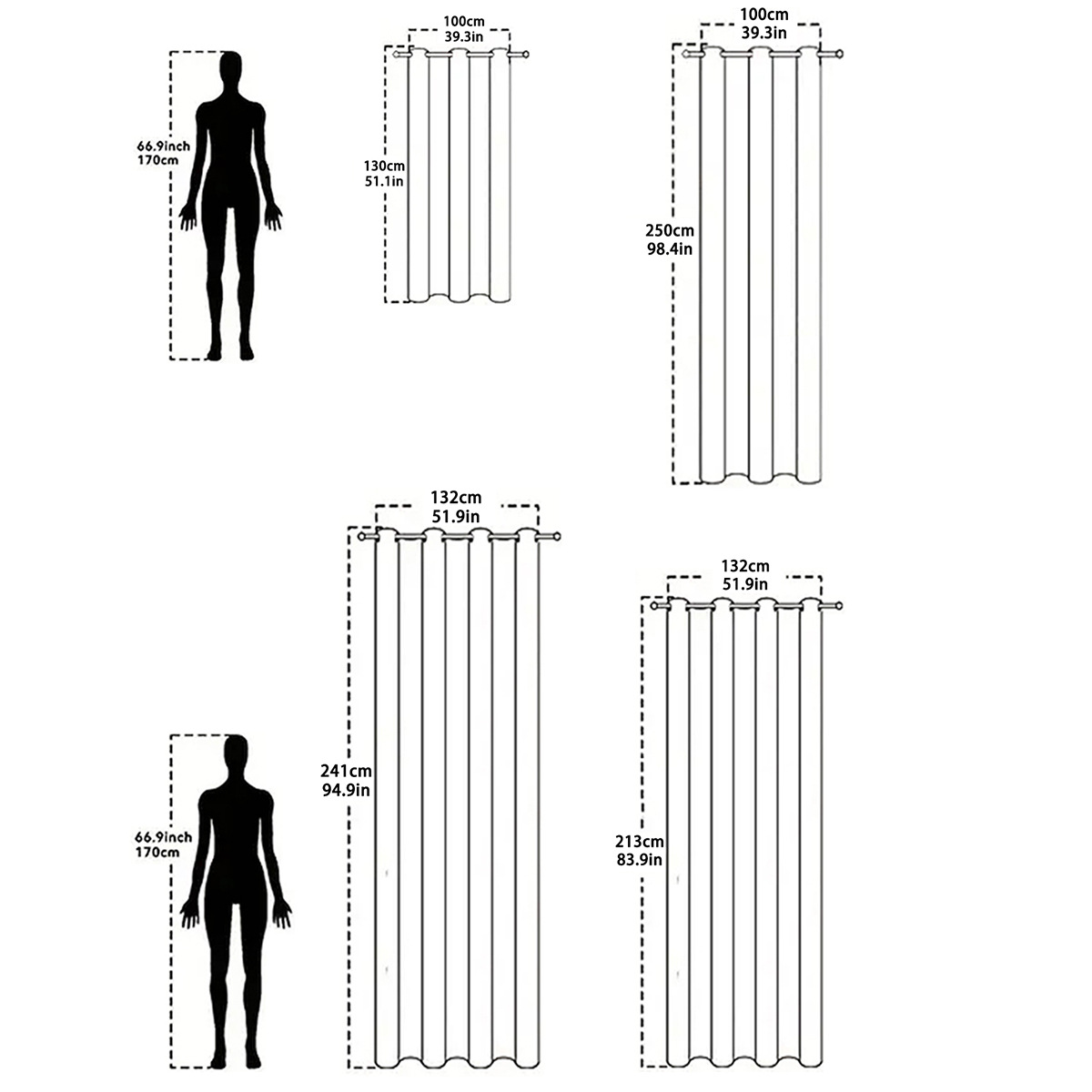 | Especificaciones | 100*130cm (una pieza perforada),100*250cm (una pieza perforada),132*213cm (una pieza perforada),132*241cm (una pieza perforada) |