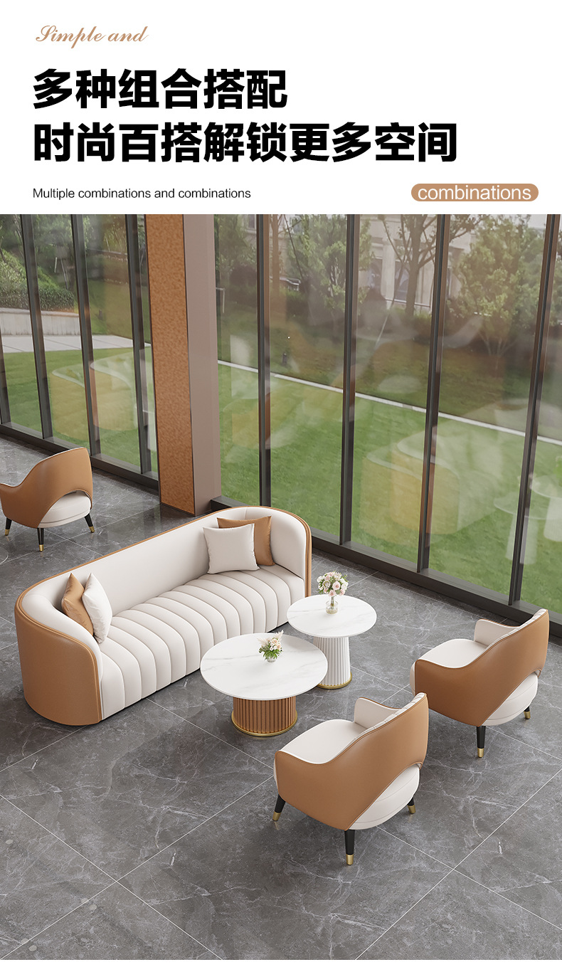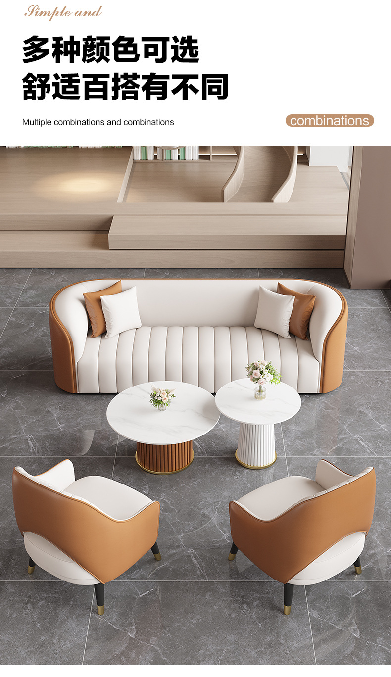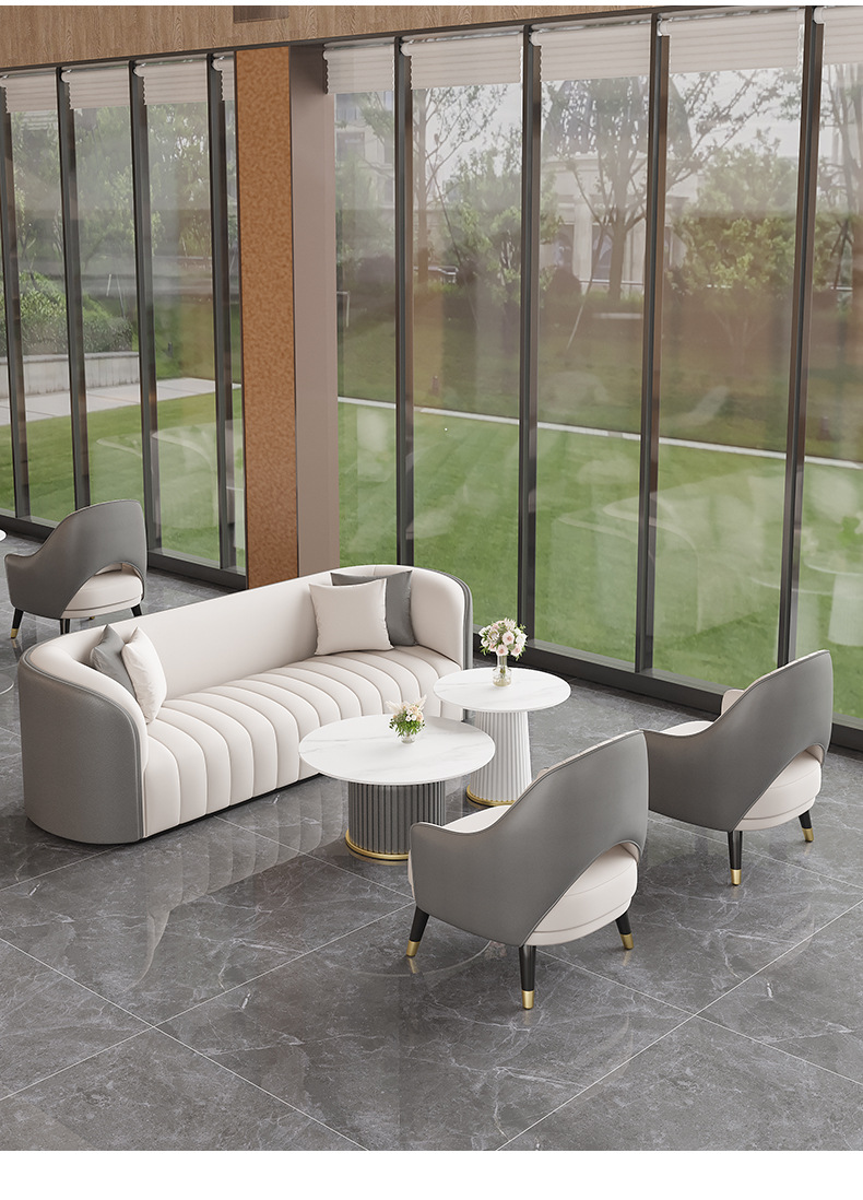 Sofá simple y lujoso, mesa de té, hotel de ocio, recepción de ventas, mesa y silla, salón de belleza para invitados.