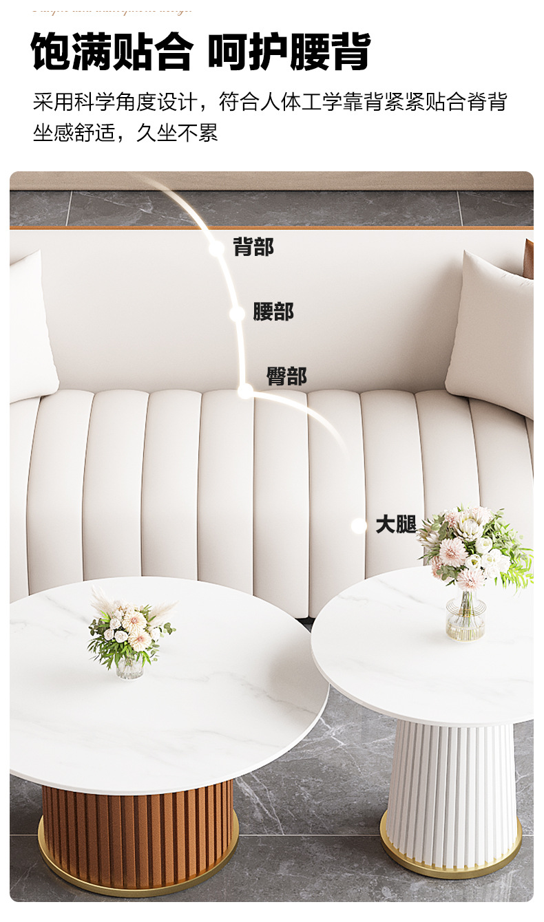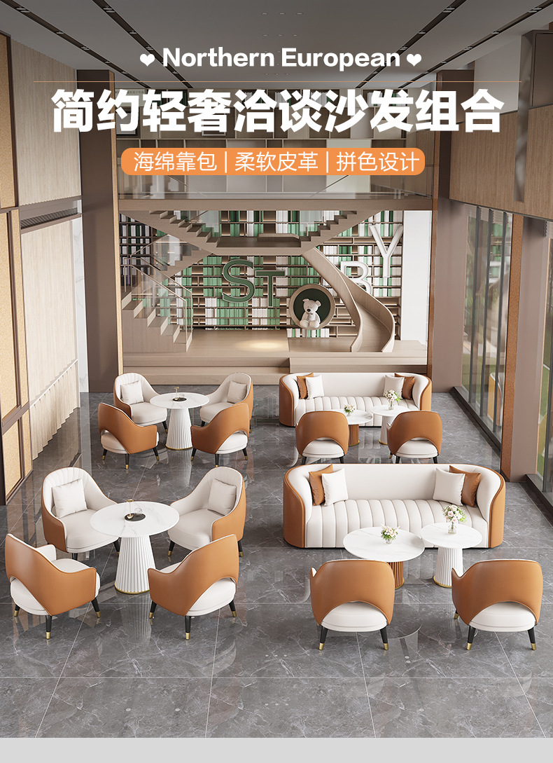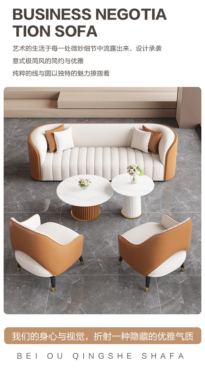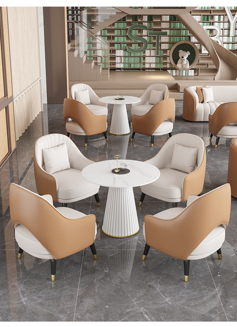 Sofá simple y lujoso, mesa de té, hotel de ocio, recepción de ventas, mesa y silla, salón de belleza para invitados.