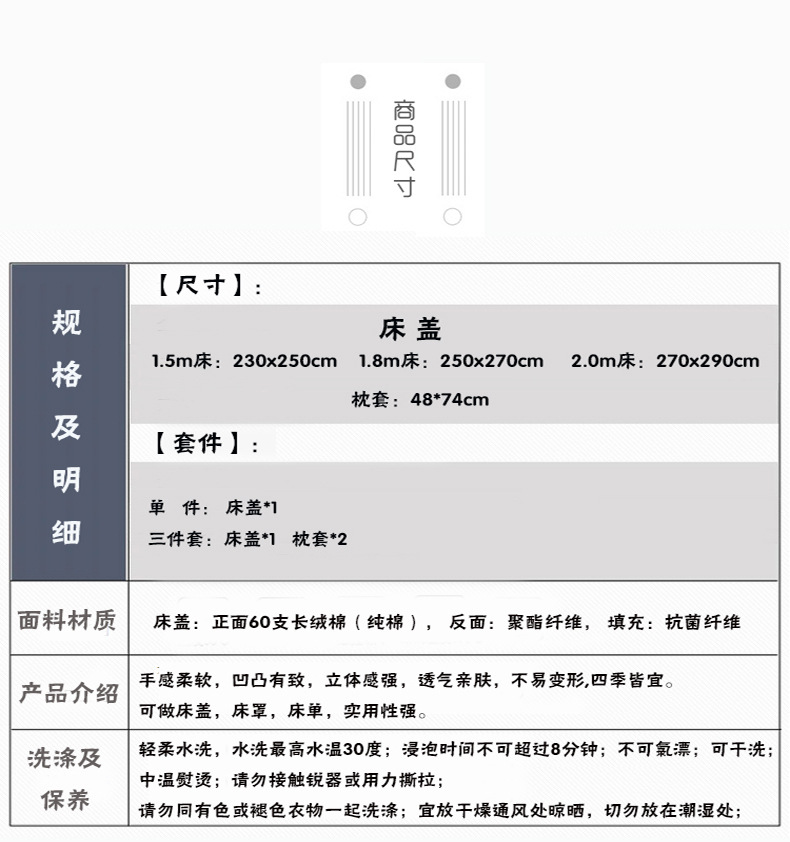 | Especificaciones de tamaño | Una sola cubierta de cama 230 * 245cm, una sola cubierta de cama 245 * 270cm, una sola cubierta de cama 270 * 290cm, cubierta de cama 230 * 245cm conjunto de tres piezas, cubierta de cama 245 * 270cm conjunto de tres piezas, cubierta de cama 270 * 290cm conjunto de tres piezas |