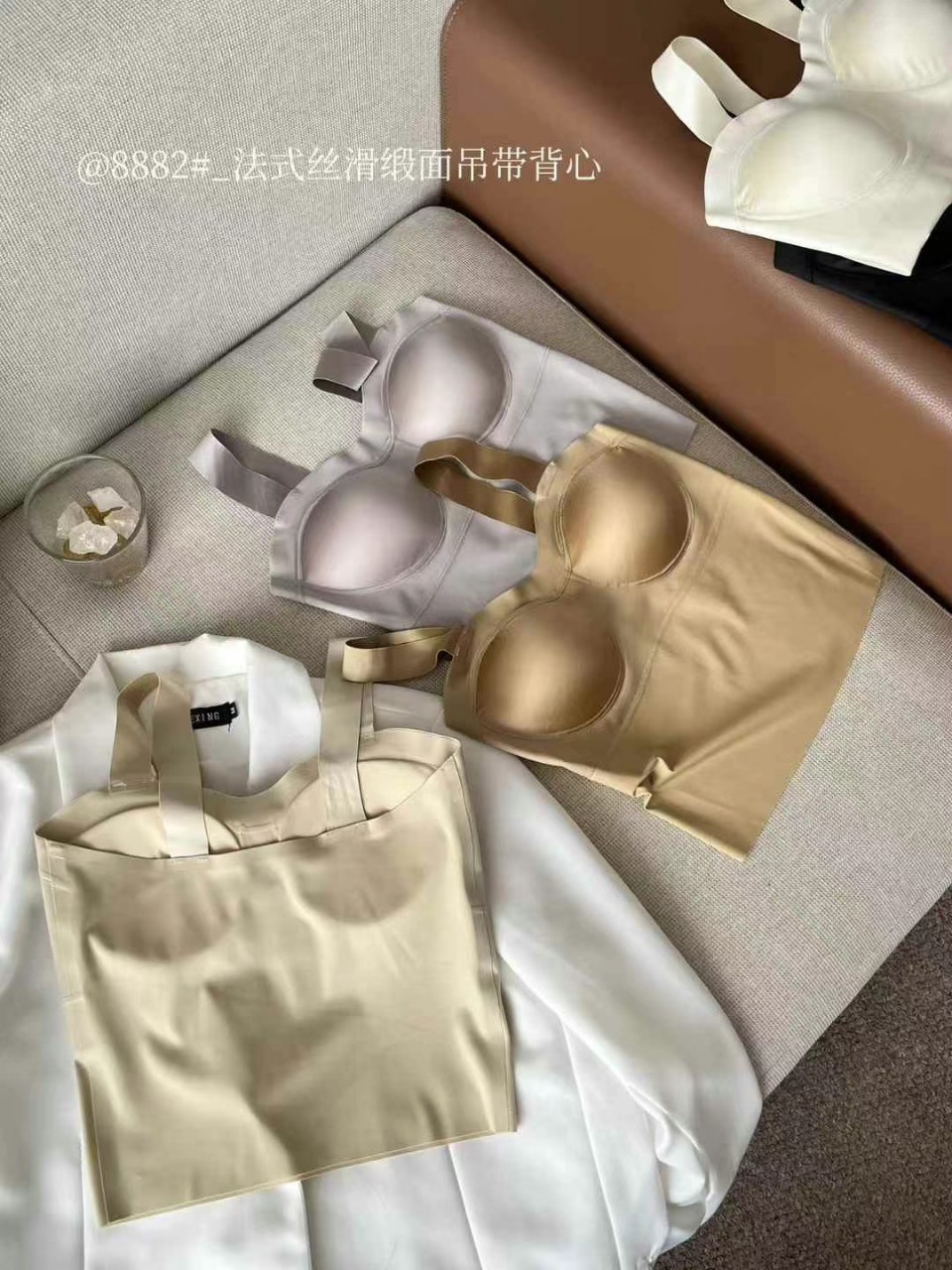 8881 # nueva taza de concha elástica elástica fija taza con cojín de pecho con cinturón de satén para mujeres