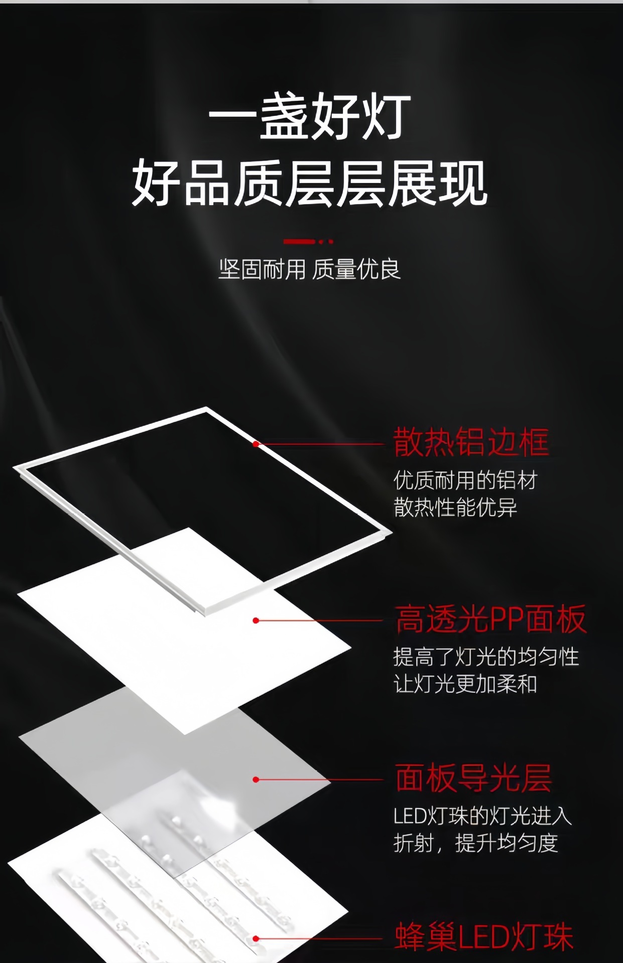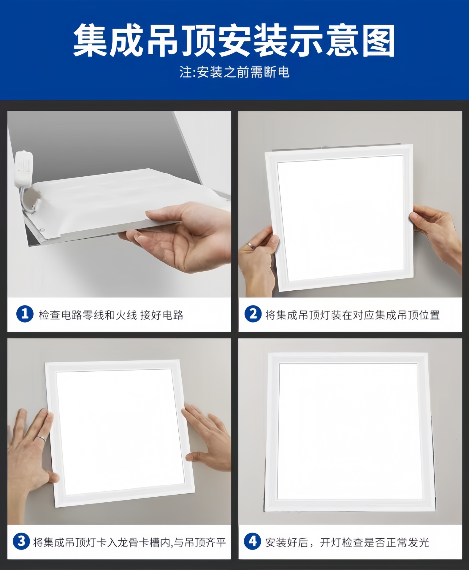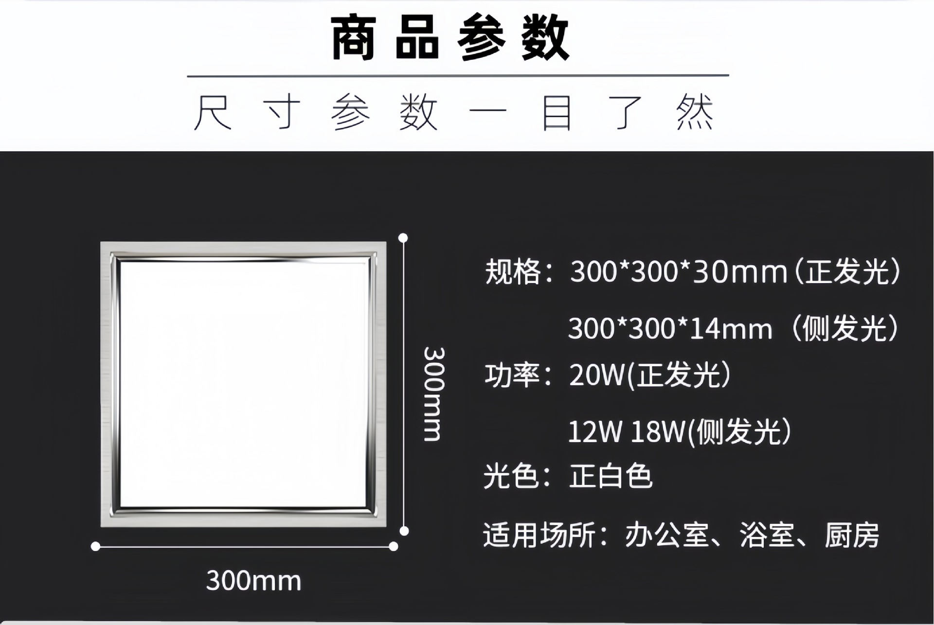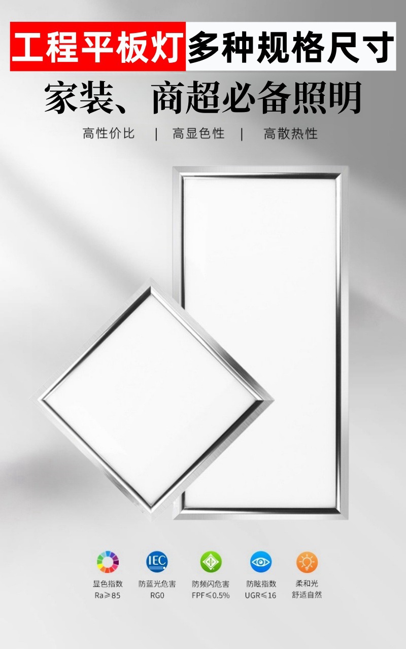 | Poder | 300*300(20W luz positiva),300*300(12W luz lateral),300*300(18W luz lateral),300*600(40W luz positiva),300*600 (luz lateral de 24W),600*600(50W luz positiva),600*600(80W luz positiva),300*1200(60W luz positiva),600*1200(120W luz positiva) |