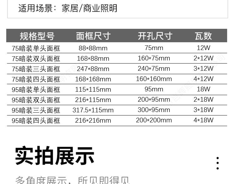 | Potencia | 75 Marcos de una sola cabeza ocultos 12w - 88 * 88,75 marcos de dos cabezas ocultos 12w - 168 * 88,75 marcos de tres cabezas ocultos 12w - 247 * 88,95 marcos de una sola cabeza ocultos 18W - 115 * 115,95 marcos de dos cabezas ocultos 18W - 216 * 115,95 marcos de tres cabezas ocultos 18W - 317,5 * 115 |