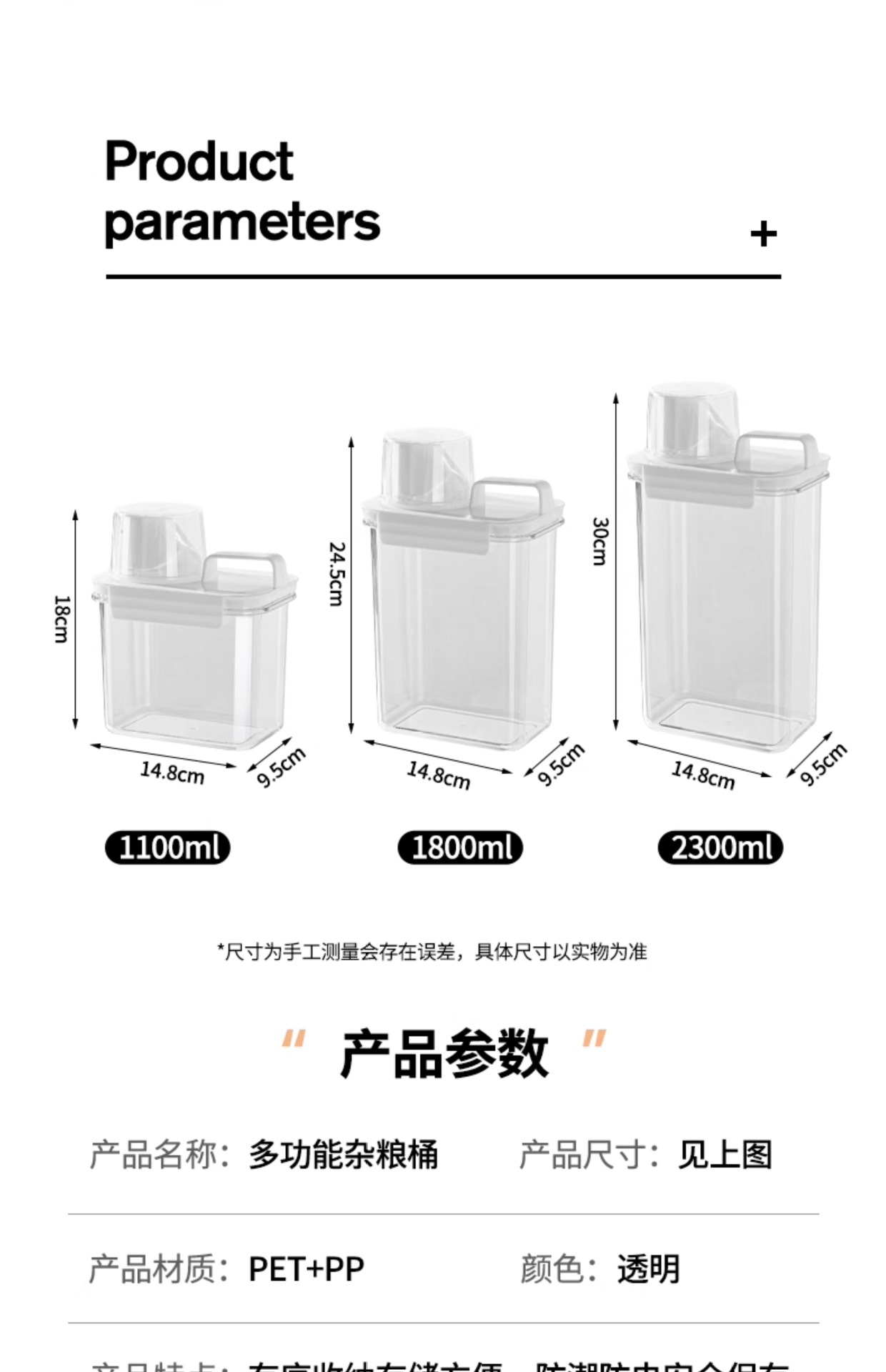 | Color | Pet engrosado de grado alimenticio de 1.100 ML en tamaño pequeño, PET engrosado de grado alimenticio de 1.800 ML en tamaño medio y PET engrosado de grado alimenticio de 2.300 ML en tamaño grande |