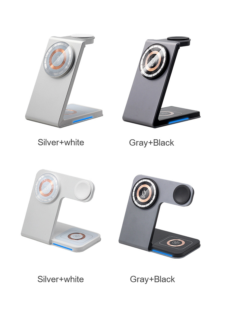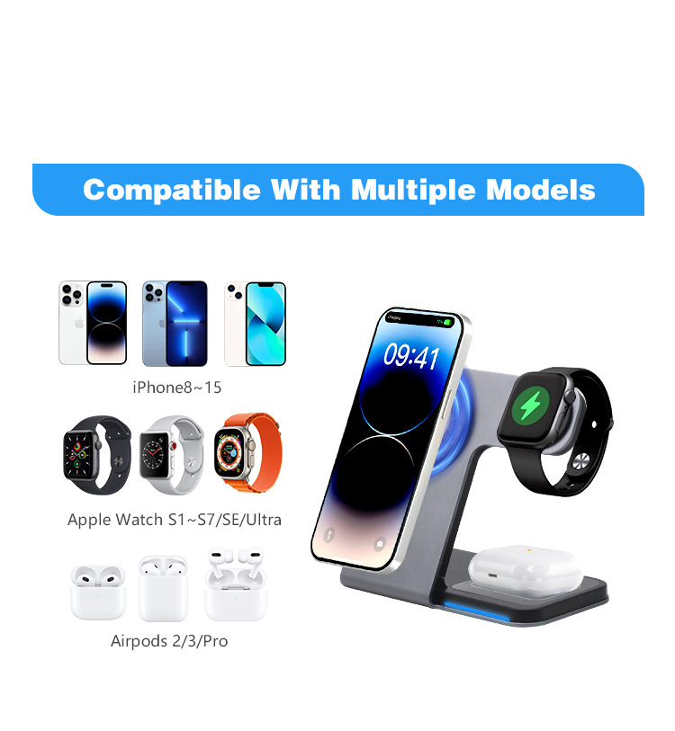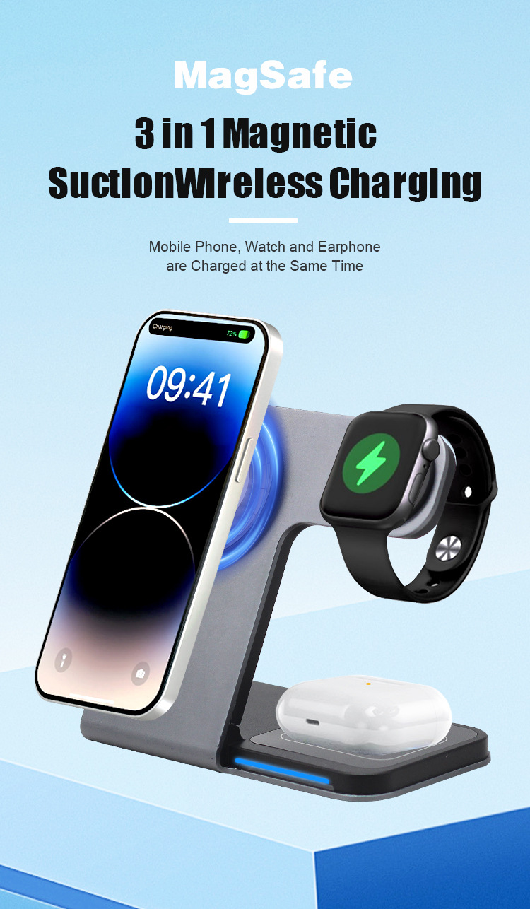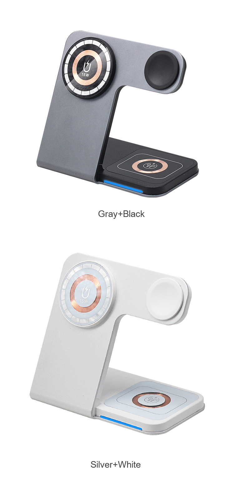 Cargador inalámbrico tres en uno magnético transfronterizo de 15W, soporte para teléfono móvil, aleación de aluminio, carga rápida conveniente, cargador inalámbrico