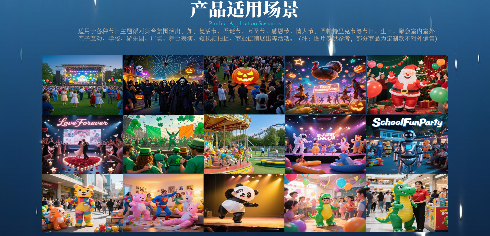 | Escenarios aplicables | Fiesta Parque escolar parque de atracciones parque de atracciones centro comercial fiesta promocional fiesta cumpleaños evento padre - hijo actuación escénica |