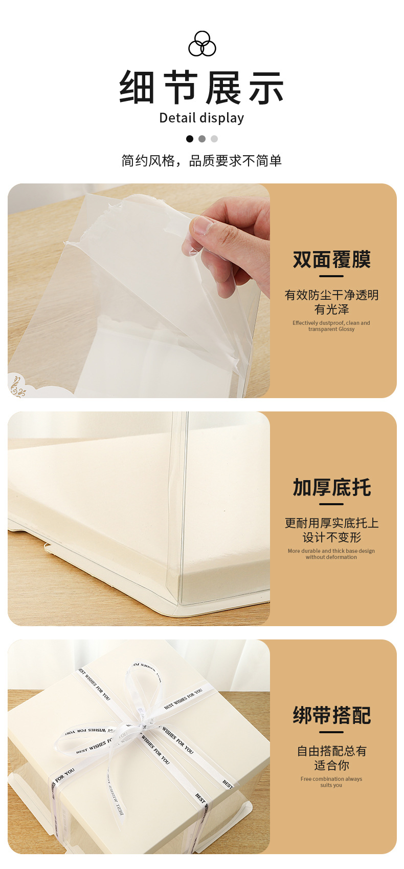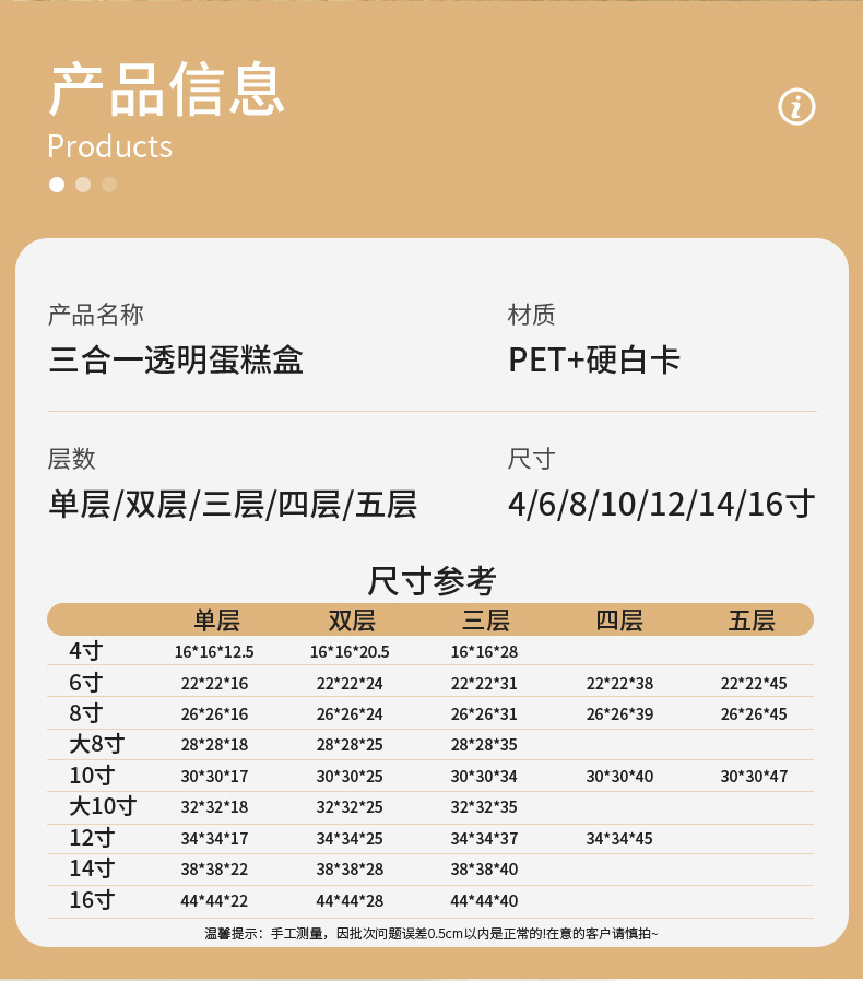 | Modelo de especificación | 4 pulgadas de una sola capa (16*16*12,5 cm)* cubierta blanca con fondo blanco,Doble capa de 4 pulgadas (16*16*20,5 cm)* cubierta blanca sobre fondo blanco,4 pulgadas de tres capas (16*16*28cm)* cubierta blanca con fondo blanco,Capa única de 6 pulgadas (22*22*16cm)* cubierta blanca sobre fondo blanco,Doble capa de 6 pulgadas (22*22*24cm)* cubierta blanca sobre fondo blanco,6 pulgadas de tres capas (22*22*31cm)* cubierta blanca con fondo blanco,6 pulgadas cuatro capas (22*22*38cm)* cubierta blanca fondo blanco,6 pulgadas cinco capas (22*22*45cm)* cubierta blanca fondo blanco,Capa única de 8 pulgadas (26*26*18cm)* cubierta blanca sobre fondo blanco,Doble capa de 8 pulgadas (26*26*24cm)* cubierta blanca sobre fondo blanco,8 pulgadas de tres capas (26*26*31cm)* cubierta blanca con fondo blanco,4 capas de 8 pulgadas (26*26*39cm)* cubierta blanca sobre fondo blanco,8 pulgadas cinco capas (26*26*45cm)* cubierta blanca fondo blanco,10 pulgadas de una sola capa (30*30*18cm)* cubierta blanca con fondo blanco,Doble capa de 10 pulgadas (30*30*25cm)* cubierta blanca sobre fondo blanco,10 pulgadas de tres capas (30*30*34cm)* cubierta blanca con fondo blanco,10 pulgadas cuatro capas (30*30*40cm)* cubierta blanca fondo blanco,10 pulgadas cinco capas (30*30*47cm)* cubierta blanca fondo blanco,12 pulgadas de una sola capa (34*34*18cm)* cubierta blanca con fondo blanco,Doble capa de 12 pulgadas (34*34*28cm)* cubierta blanca sobre fondo blanco,12 pulgadas de tres capas (34*34*37cm)* cubierta blanca con fondo blanco,Capa única de 14 pulgadas (39*39*22cm)* cubierta blanca y fondo blanco,Doble capa de 14 pulgadas (39*39*28cm)* cubierta blanca sobre fondo blanco,14 pulgadas de tres capas (39*39*40cm)* cubierta blanca con fondo blanco,Capa única de 16 pulgadas (44*44*22cm)* cubierta blanca y fondo blanco,Doble capa de 16 pulgadas (44*44*28cm)* cubierta blanca sobre fondo blanco,16 pulgadas de tres capas (44*44*40cm)* cubierta blanca con fondo blanco |
