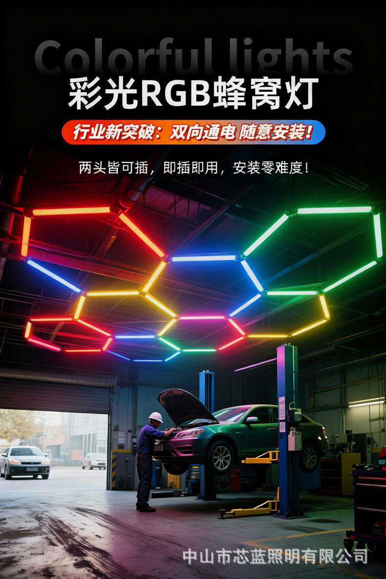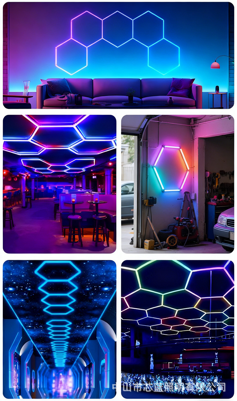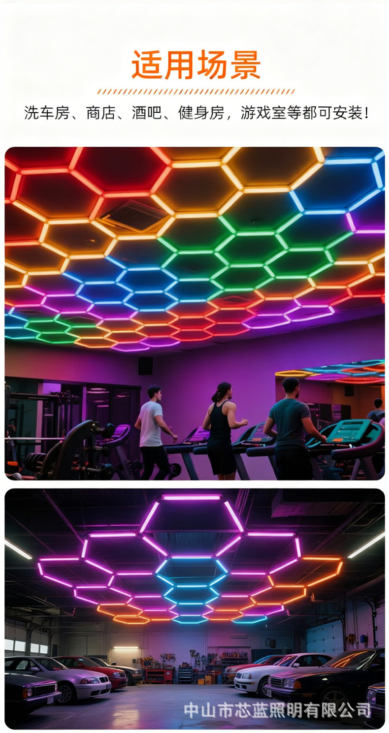 Luz transfronteriza deslumbrante RGB atmósfera de cambio de color caballo corriendo lámpara led nido de control aplicación de lavado de autos estación de garaje lámpara hexagonal