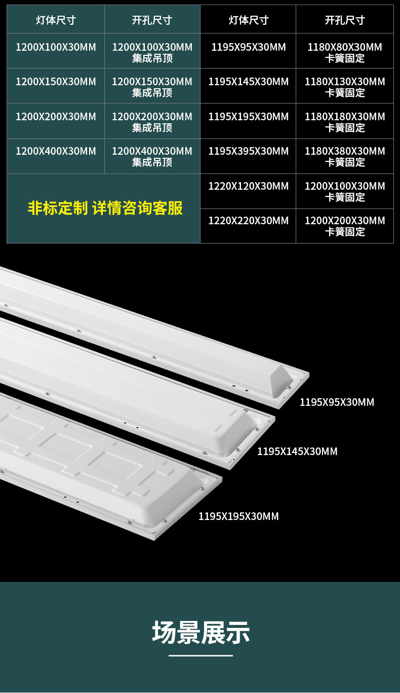 Lámpara de panel LED 200 * 1200 lámpara de panel de luz directa 100 * 1200 lámpara de techo incrustada de agujero abierto de placa de yeso
