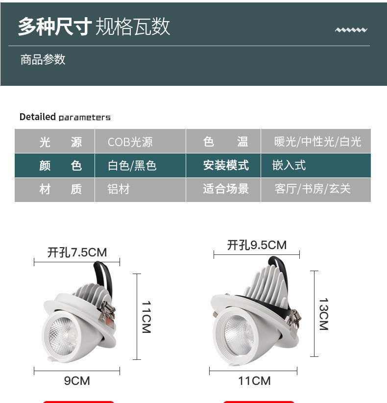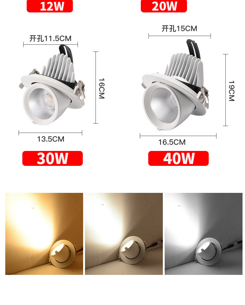 | Potencia | Lámpara de nariz de elefante 2,5 pulgadas 12w [agujero 7,8 - 8cm], lámpara de nariz de elefante 3 pulgadas 20w [agujero 9,5 - 10cm], lámpara de nariz de elefante 4 pulgadas 30w [agujero 11,5 - 12,5cm], lámpara de nariz de elefante 5 pulgadas 40w [agujero 14 - 15,5cm] |