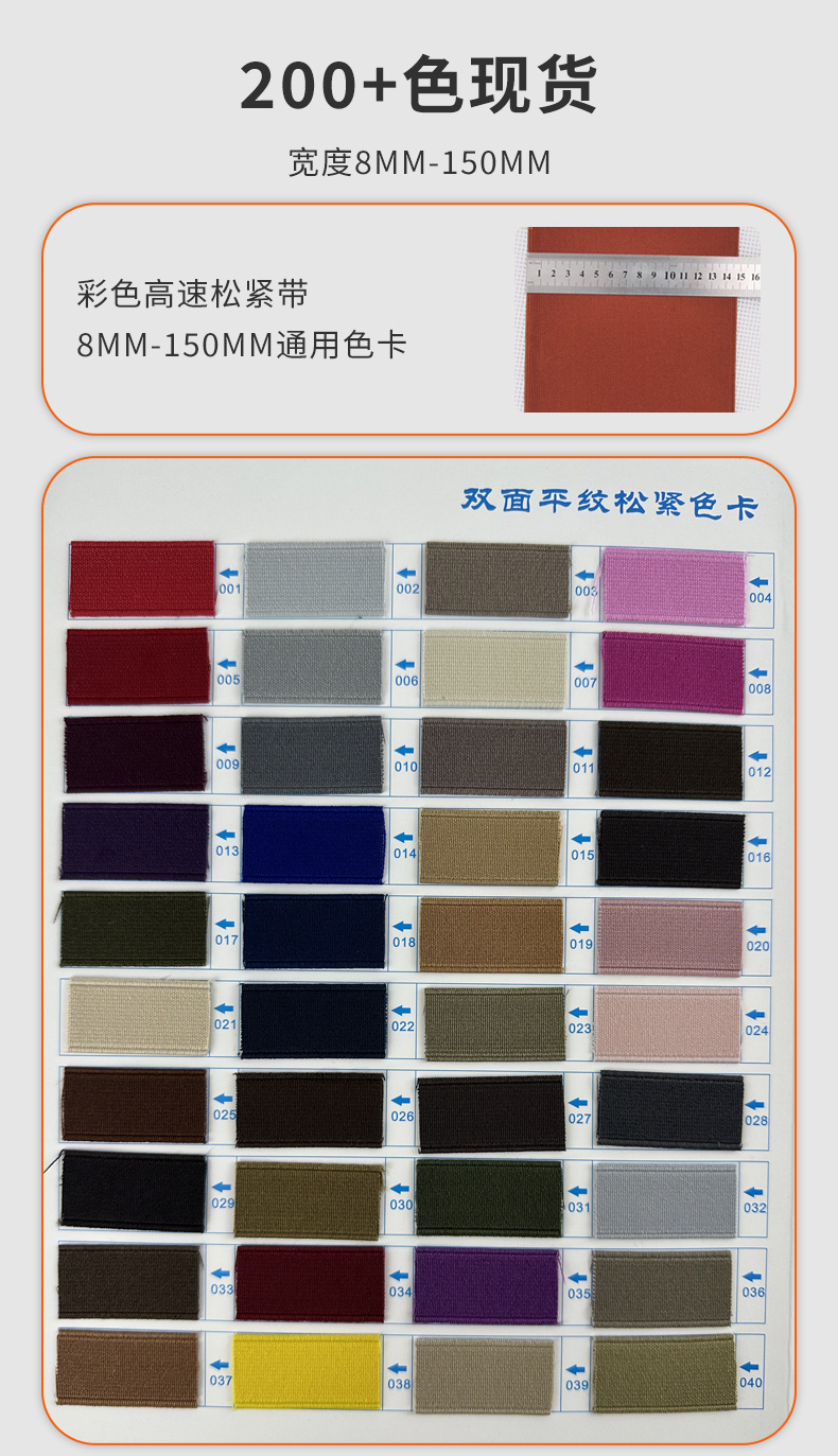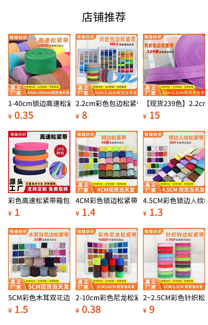 | Especificaciones y modelos | 1CM彩色锁边高速松紧带一卷110码拍下备注色号,1.2CM彩色锁边高速松紧带一卷100码拍下备注色号,1.5CM彩色锁边高速松紧带一卷22码拍下备注色号,2CM彩色锁边高速松紧带一卷33码拍下备注色号,2.5CM彩色锁边高速松紧带一卷33码拍下备注色号,3CM彩色锁边高速松紧带一卷33码拍下备注色号,3.5CM彩色锁边高速松紧带一卷33码按拍下备注色号,4CM彩色锁边高速松紧带一卷33码拍下备注色号,5CM彩色锁边高速松紧带一卷33码拍下备注色号,6CM彩色锁边高速松紧带一卷33码拍下备注色号,7CM彩色锁边高速松紧带一卷50码拍下备注色号,8CM彩色锁边高速松紧带一卷50码拍下备注色号,9CM彩色锁边高速松紧带一卷50码拍下备注色号,10CM彩色锁边高速松紧带一卷50码拍下备注色号,13CM彩色锁边高速松紧带一卷50码拍下备注色号,1CM黑色锁边高速松紧带一卷55码,1.2CM黑色锁边高速松紧带一卷55码,1.5CM黑色锁边高速松紧带一卷43码,2CM黑色锁边高速松紧带一卷43码,2.5CM黑色锁边高速松紧带一卷43码,3CM黑色锁边高速松紧带一卷43码,3.5CM黑色锁边高速松紧带一卷43码,4CM黑色锁边高速松紧带一卷43码,4.5CM黑色锁边高速松紧带一卷43码,5CM黑色锁边高速松紧带一卷43码,6CM黑色锁边高速松紧带一卷43码,7CM黑色锁边高速松紧带一卷43码,7.5CM黑色锁边高速松紧带一卷43码,8CM黑色锁边高速松紧带一卷43码,9CM黑色锁边高速松紧带一卷43码,10CM黑色锁边高速松紧带一卷43码,11CM黑色锁边高速松紧带一卷43码,12CM黑色锁边高速松紧带一卷43码,12.5CM黑色锁边高速松紧带一卷43码,13CM黑色锁边高速松紧带一卷43码,15CM黑色锁边高速松紧带一卷43码,1CM白色锁边高速松紧带一卷55码,1.2CM白色锁边高速松紧带一卷55码,1.5CM白色锁边高速松紧带一卷40码,2CM白色锁边高速松紧带一卷43码,2.5CM白色锁边高速松紧带一卷43码,3CM白色锁边高速松紧带一卷43码,3.5CM白色锁边高速松紧带一卷43码,4CM白色锁边高速松紧带一卷43码,4.5CM白色锁边高速松紧带一卷43码,5CM白色锁边高速松紧带一卷43码,6CM白色锁边高速松紧带一卷43码,7CM白色锁边高速松紧带一卷43码,7.5CM白色锁边高速松紧带一卷43码,8CM白色锁边高速松紧带一卷43码,9CM白色锁边高速松紧带一卷43码,10CM白色锁边高速松紧带一卷43码,11CM白色锁边高速松紧带一卷43码,12CM白色锁边高速松紧带一卷43码,12.5CM白色锁边高速松紧带一卷43码,13CM白色锁边高速松紧带一卷43码,15CM白色锁边高速松紧带一卷43码 |