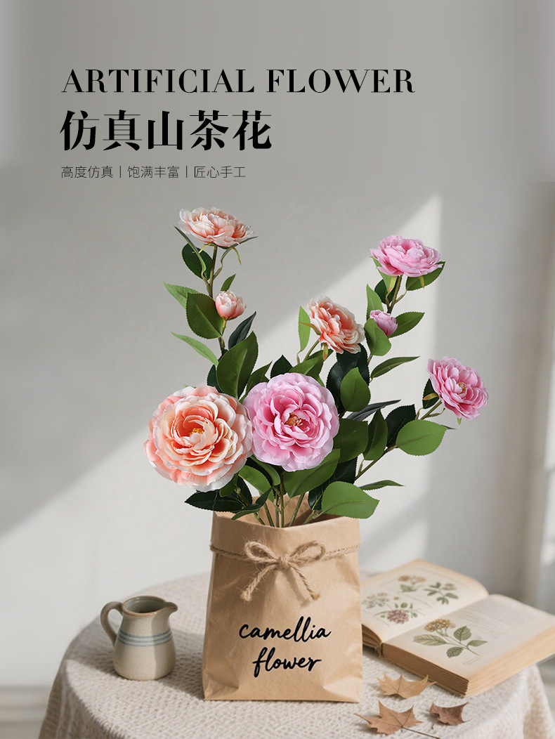 Simulación camellia sala de estar decoración de TV decoración floral decoración flor de seda flor de plástico único ramo de flores falsas decoración flor seca