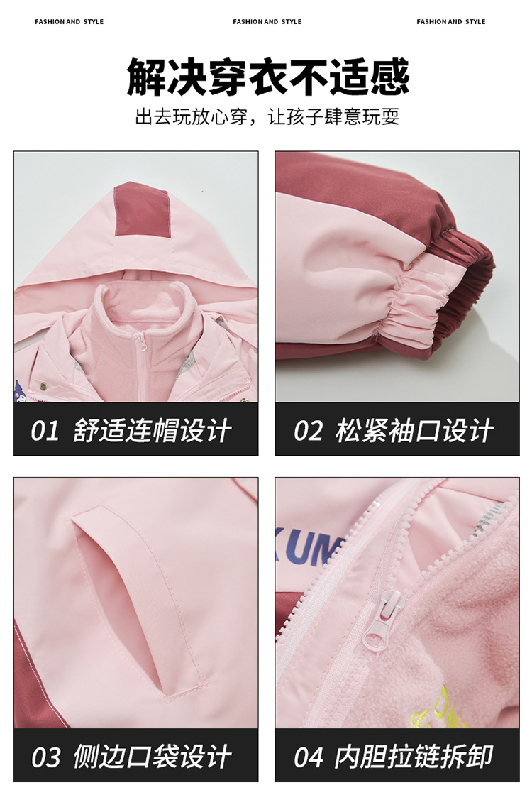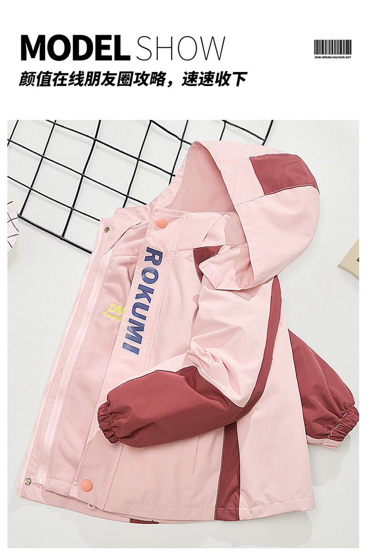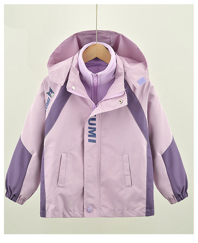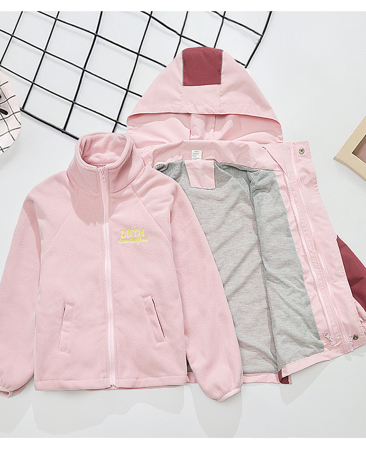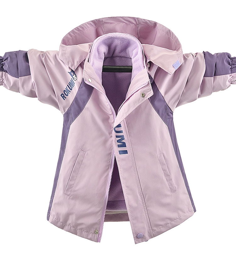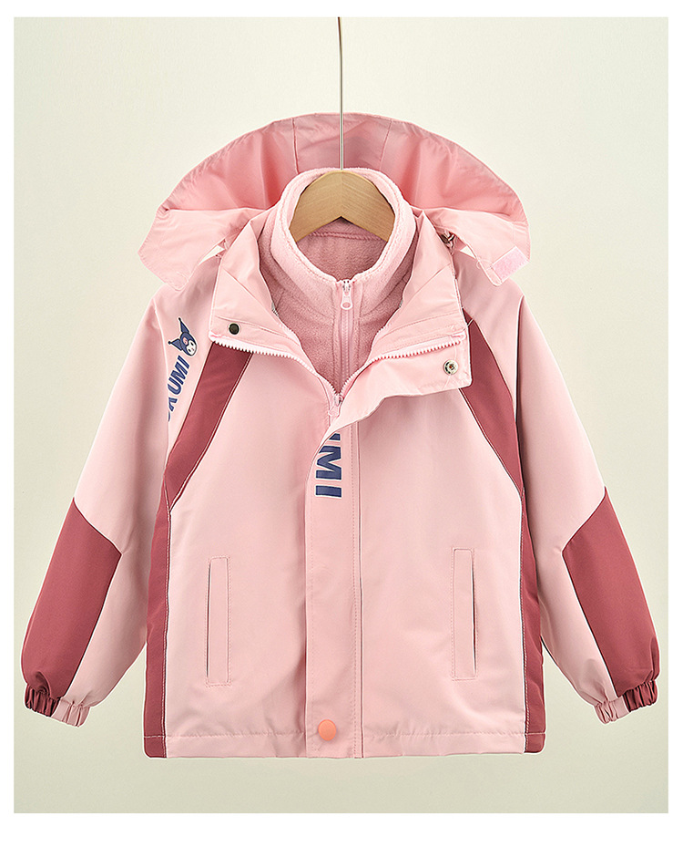 Primavera, otoño y invierno para niñas con un nuevo tipo de ropa de aire extranjero para niños desmontables de abrigo de asalto con dibujos animados de terciopelo de color combinado 3 en 1 abrigo cálido