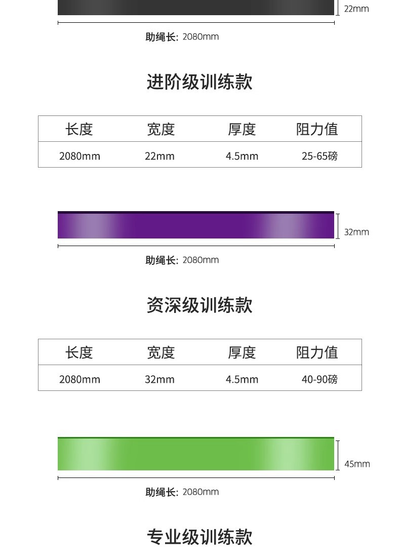 | Color | Rojo 15 - 35 libras [entrada], negro 25 - 65 libras [avanzado], morado 40 - 90 libras [actualizado], verde 50 - 125 libras [profesional] |
