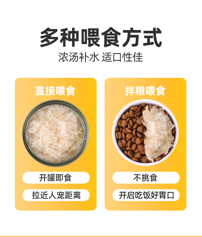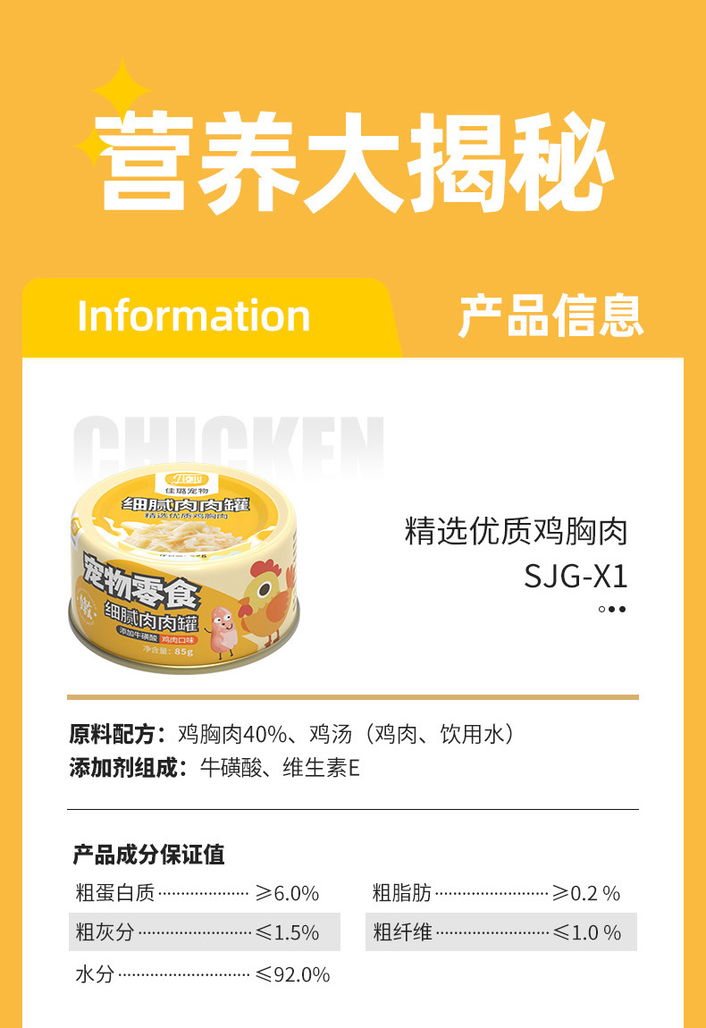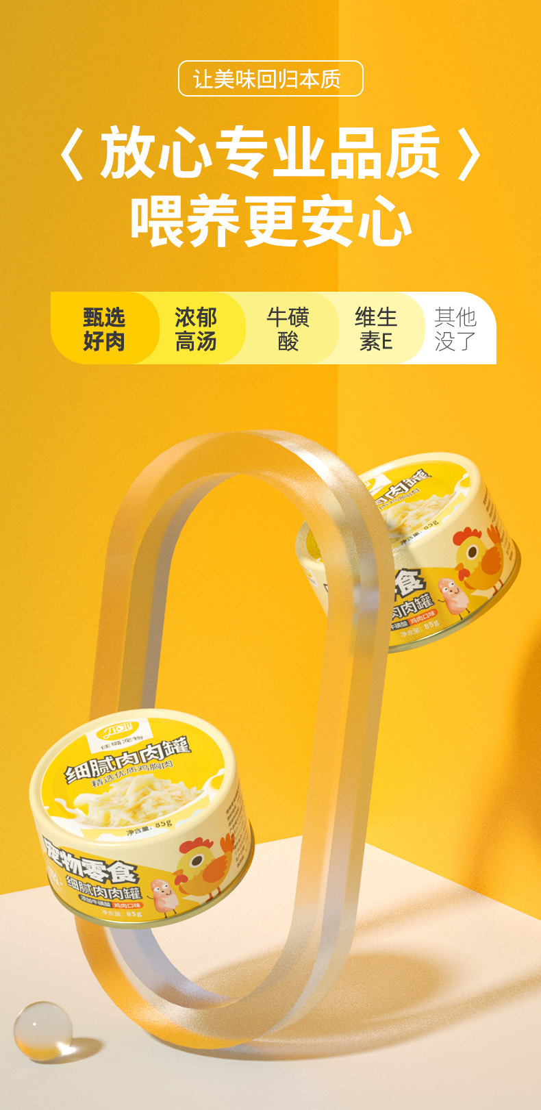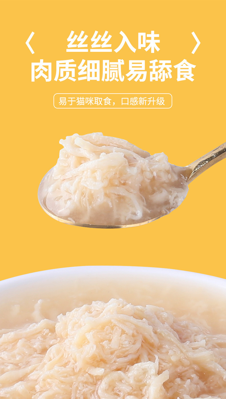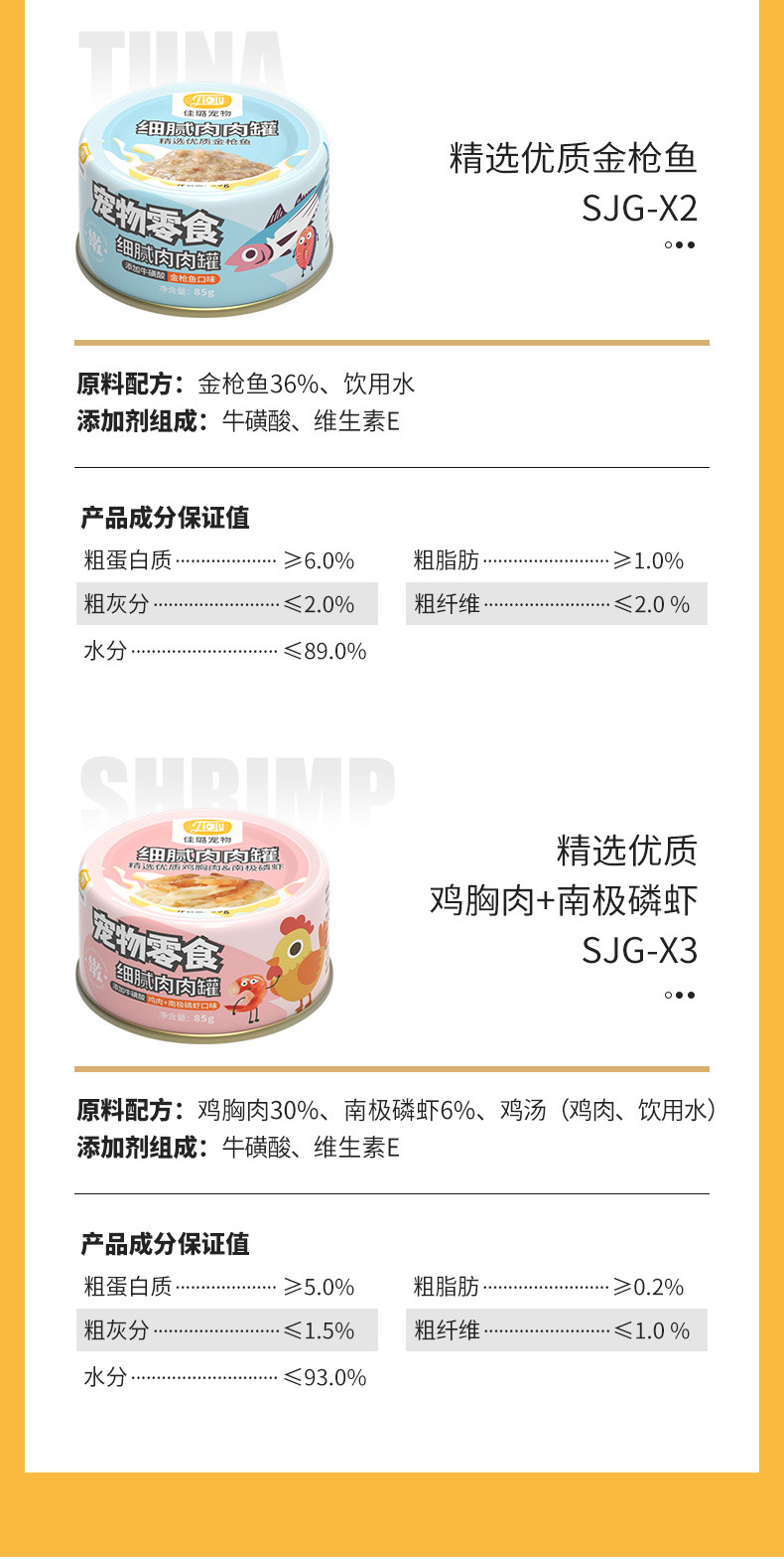 | Sabores | Latas de carne delicadas - sabor a pollo, latas de carne delicadas - sabor a pescado de pistola de oro, latas de carne delicadas - sabor a krill de pollo |