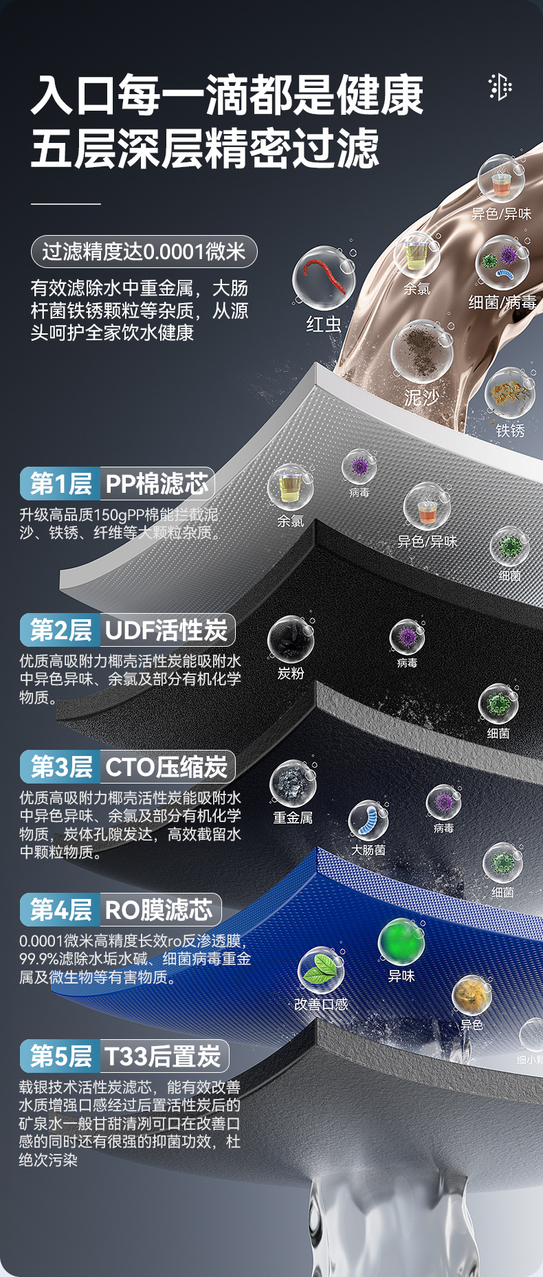 | Efectos de purificación de agua | Metales pesados, óxido, sedimentos, bacterias, virus, otros |