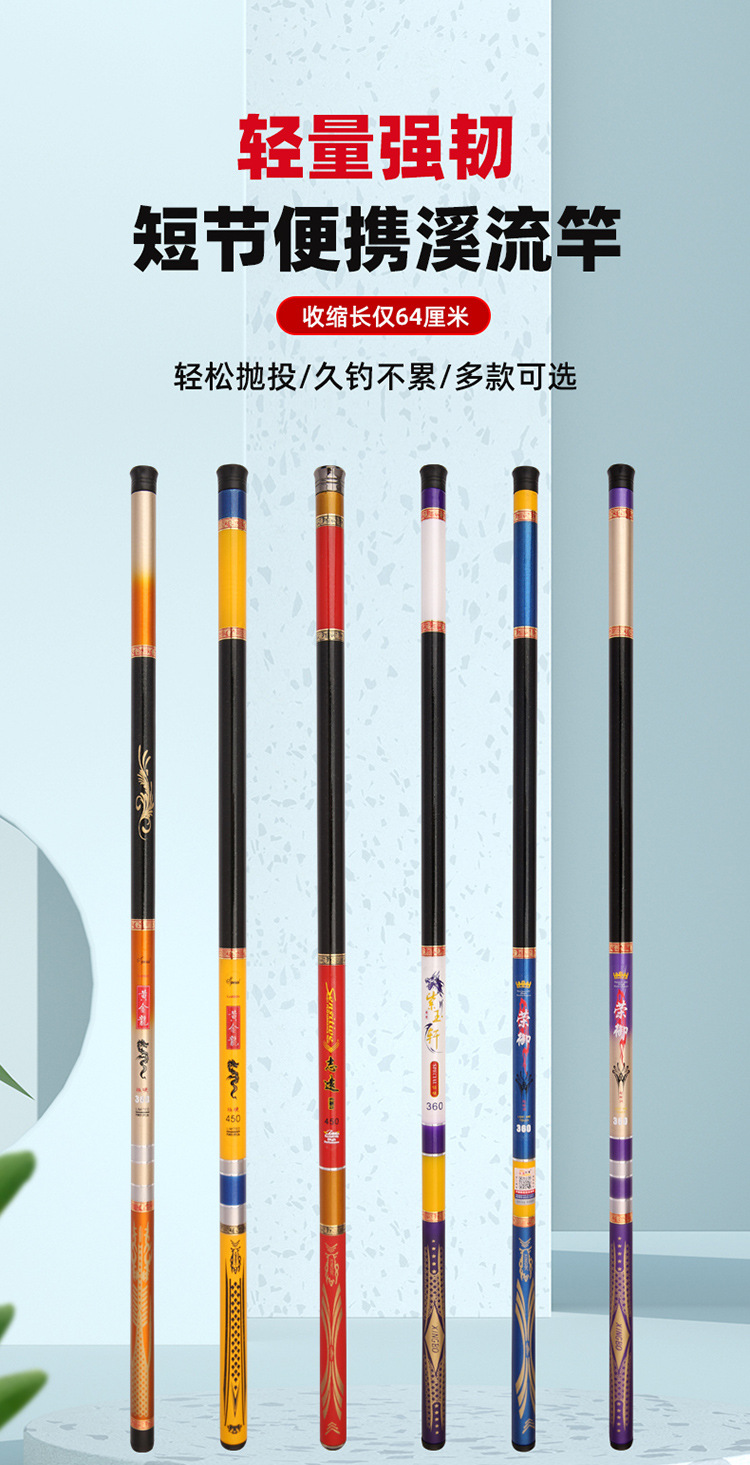 Zhenyi nuevo producto varilla de mano de 2.7 - 7.2 metros varilla de arroyo multicolor opcional contracción 60 cm de caña de pesca al por mayor