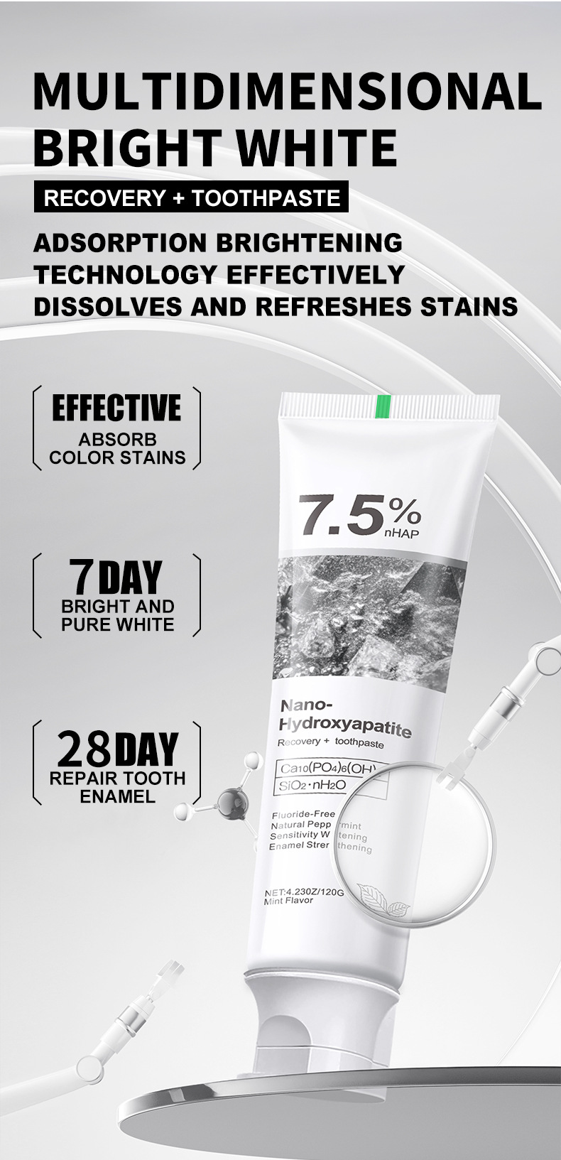 Ventas transfronterizas calientes 7,5% nano hidroxiapatita pasta de dientes reparación esmalte blanqueamiento de eliminación de manchas 120g fábrica mayorista