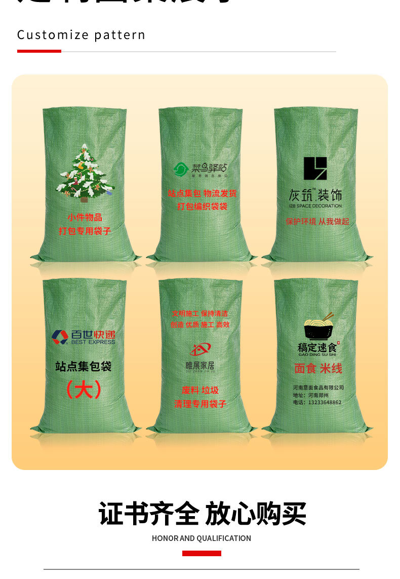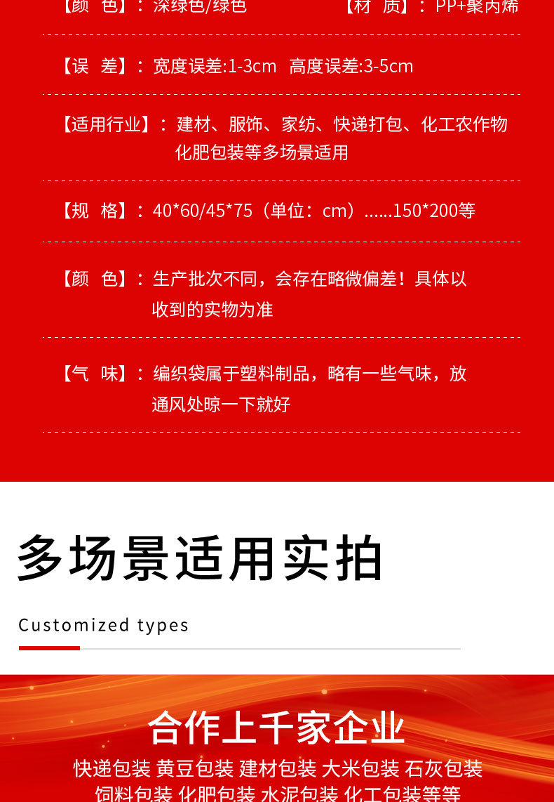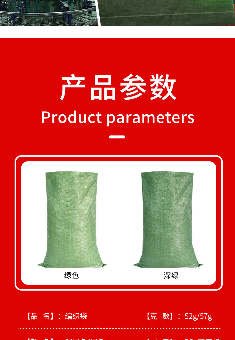 | Especificaciones y modelos | 蛇皮编织袋——页面标注尺寸均为下料尺寸;40*60(绿色52g),蛇皮编织袋——页面标注尺寸均为下料尺寸;45*75(绿色52g),蛇皮编织袋——页面标注尺寸均为下料尺寸;50*80(绿色52g),蛇皮编织袋——页面标注尺寸均为下料尺寸;50*90(绿色52g),蛇皮编织袋——页面标注尺寸均为下料尺寸;60*80(绿色52g),蛇皮编织袋——页面标注尺寸均为下料尺寸;70*113(灰绿52g),蛇皮编织袋——页面标注尺寸均为下料尺寸;80*100(灰绿52g),蛇皮编织袋——页面标注尺寸均为下料尺寸;80*120(灰绿52g),蛇皮编织袋——页面标注尺寸均为下料尺寸;80*130(灰绿52g),蛇皮编织袋——页面标注尺寸均为下料尺寸;90*100(灰绿52g),蛇皮编织袋——页面标注尺寸均为下料尺寸;90*110(灰绿52g),蛇皮编织袋——页面标注尺寸均为下料尺寸;90*120(灰绿52g),蛇皮编织袋——页面标注尺寸均为下料尺寸;90*130(灰绿52g),蛇皮编织袋——页面标注尺寸均为下料尺寸;100*120(灰绿52g),蛇皮编织袋——页面标注尺寸均为下料尺寸;100*140(灰绿52g),蛇皮编织袋——页面标注尺寸均为下料尺寸;100*150(灰绿52g),蛇皮编织袋——页面标注尺寸均为下料尺寸;40*60(绿色加厚57g),蛇皮编织袋——页面标注尺寸均为下料尺寸;45*75(绿色加厚57g),蛇皮编织袋——页面标注尺寸均为下料尺寸;50*80(绿色加厚57g),蛇皮编织袋——页面标注尺寸均为下料尺寸;50*90(绿色加厚57g),蛇皮编织袋——页面标注尺寸均为下料尺寸;60*80(绿色加厚57g),蛇皮编织袋——页面标注尺寸均为下料尺寸;70*90(绿色加厚57g),蛇皮编织袋——页面标注尺寸均为下料尺寸;70*113(绿色加厚57g),蛇皮编织袋——页面标注尺寸均为下料尺寸;80*100(绿色加厚57g),蛇皮编织袋——页面标注尺寸均为下料尺寸;80*120(绿色加厚57g),蛇皮编织袋——页面标注尺寸均为下料尺寸;90*100(绿色加厚57g),蛇皮编织袋——页面标注尺寸均为下料尺寸;90*110(绿色加厚57g),蛇皮编织袋——页面标注尺寸均为下料尺寸;90*120(绿色加厚57g),蛇皮编织袋——页面标注尺寸均为下料尺寸;90*130(绿色加厚57g),蛇皮编织袋——页面标注尺寸均为下料尺寸;100*120(绿色加厚57g),蛇皮编织袋——页面标注尺寸均为下料尺寸;100*135(绿色加厚57g),蛇皮编织袋——页面标注尺寸均为下料尺寸;100*150(绿色加厚57g),蛇皮编织袋——页面标注尺寸均为下料尺寸;110*130(绿色加厚57g),蛇皮编织袋——页面标注尺寸均为下料尺寸;110*150(绿色加厚57g),蛇皮编织袋——页面标注尺寸均为下料尺寸;120*150(绿色加厚57g),蛇皮编织袋——页面标注尺寸均为下料尺寸;130*150(绿色加厚57g),蛇皮编织袋——页面标注尺寸均为下料尺寸;140*170(绿色加厚57g),蛇皮编织袋——页面标注尺寸均为下料尺寸;150*180(绿色加厚57g),蛇皮编织袋——页面标注尺寸均为下料尺寸;150*200(绿色加厚57g) |