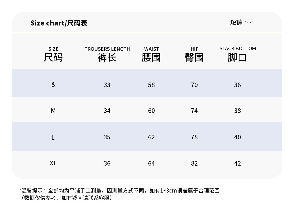 | Color | Pantalones cortos negros, pantalones cortos azules, pantalones cortos gris oscuro, pantalones cortos caqui, pantalones cortos en polvo de melocotón, pantalones cortos púrpura esmaltado, pantalones cortos rojos cereza |