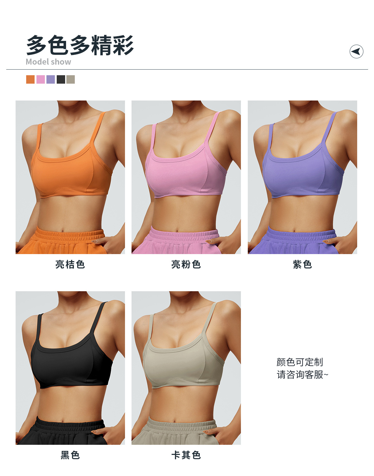 | Color | Bra naranja brillante, Bra rosa brillante, Bra khaki, Bra púrpura, Bra negro |