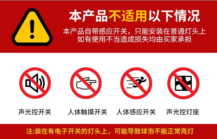 | Potencia | Inducción por radar 220V (luz desnuda), inducción por radar 220V (caja), bombilla controlada por sonido y luz 220V (luz desnuda), bombilla controlada por sonido y luz 220V (caja) |