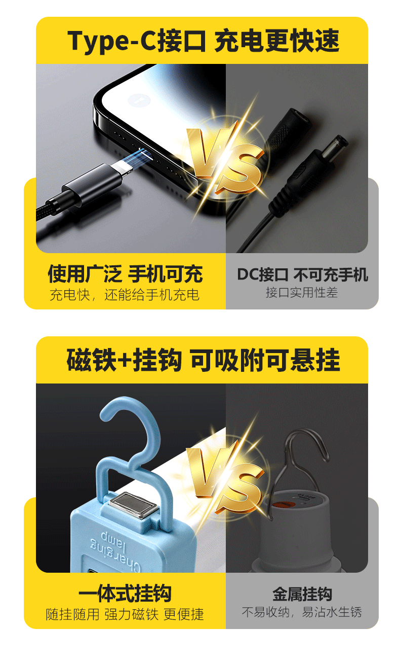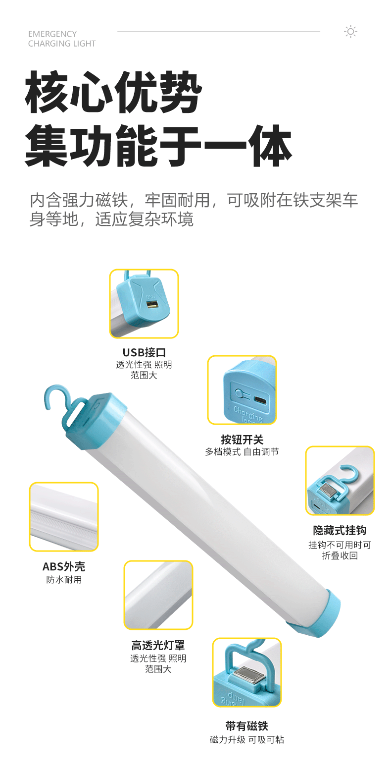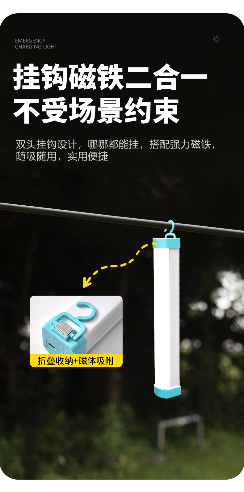 Lámpara de carga LED transfronteriza, suspensión magnética, lámpara de emergencia USB, camping en el mercado nocturno, iluminación de emergencia súper brillante de alta potencia