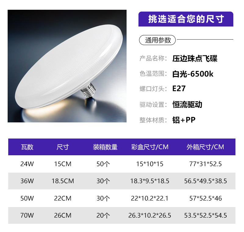 | Potencia | Platillo volador de borde integrado de azulejos de pies de 24w (cubierta de punto de perla), platillo volador de borde integrado de azulejos de pies de 36w (cubierta de punto de perla), lámpara de platillo volador de borde integrado - 50w - azulejo de pies, lámpara de platillo volador de borde integrado - 70w - azulejo de pies |