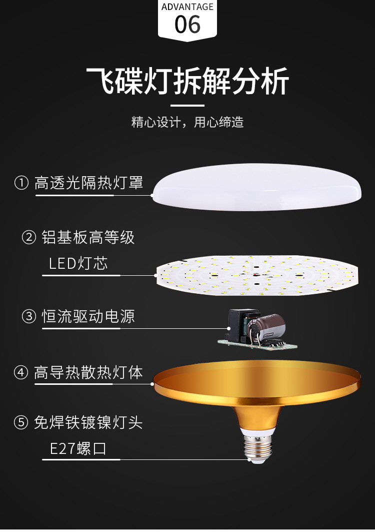 | Potencia | Lámpara de platillo volador de aleación de aluminio 12w, lámpara de platillo volador de aleación de aluminio 15w, lámpara de platillo volador de aleación de aluminio 20w, lámpara de platillo volador de aleación de aluminio 30w, lámpara de platillo volador de aleación de aluminio 40w, lámpara de platillo volador de aleación de aluminio 50w, lámpara de platillo volador de aleación de aluminio 60W |