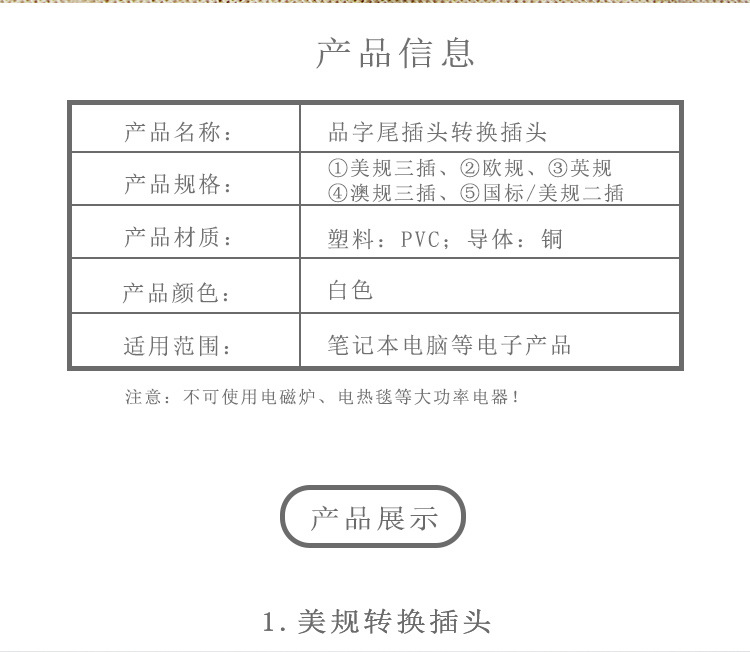 | Modelo de la especificación | ① Enchufe de conversión de cola de tres clavijas estándar estadounidense,② Enchufe de conversión de cola de PIN estándar europeo,③ Enchufe de conversión de cola de PIN estándar británico,④ Enchufe de conversión de cola de tres clavijas estándar australiano,⑤ Estándar Nacional/enchufe de conversión de cola de dos clavijas estándar americano |
