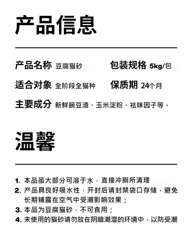 | Especificaciones | (Majoramiento de calidad) arena de gato de tofu original 9,6 jin, (Majoramiento de calidad) arena de gato de tofu de té verde 9,6 jin, (Majoramiento de calidad) arena de gato de tofu de carbón de bambú 9,6 jin, (Majoramiento de calidad) arena de gato de tofu de melocotón 9,6 jin |