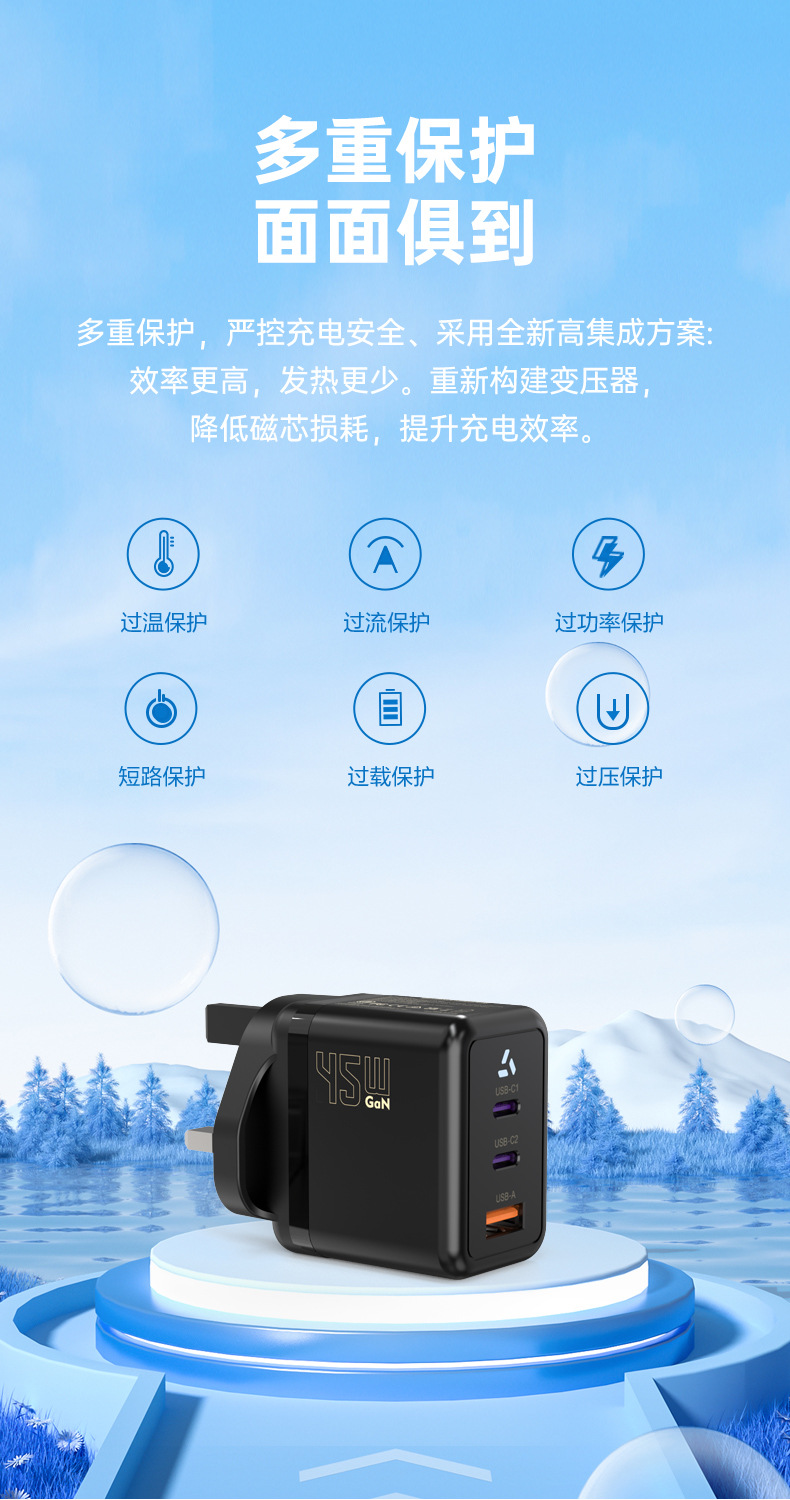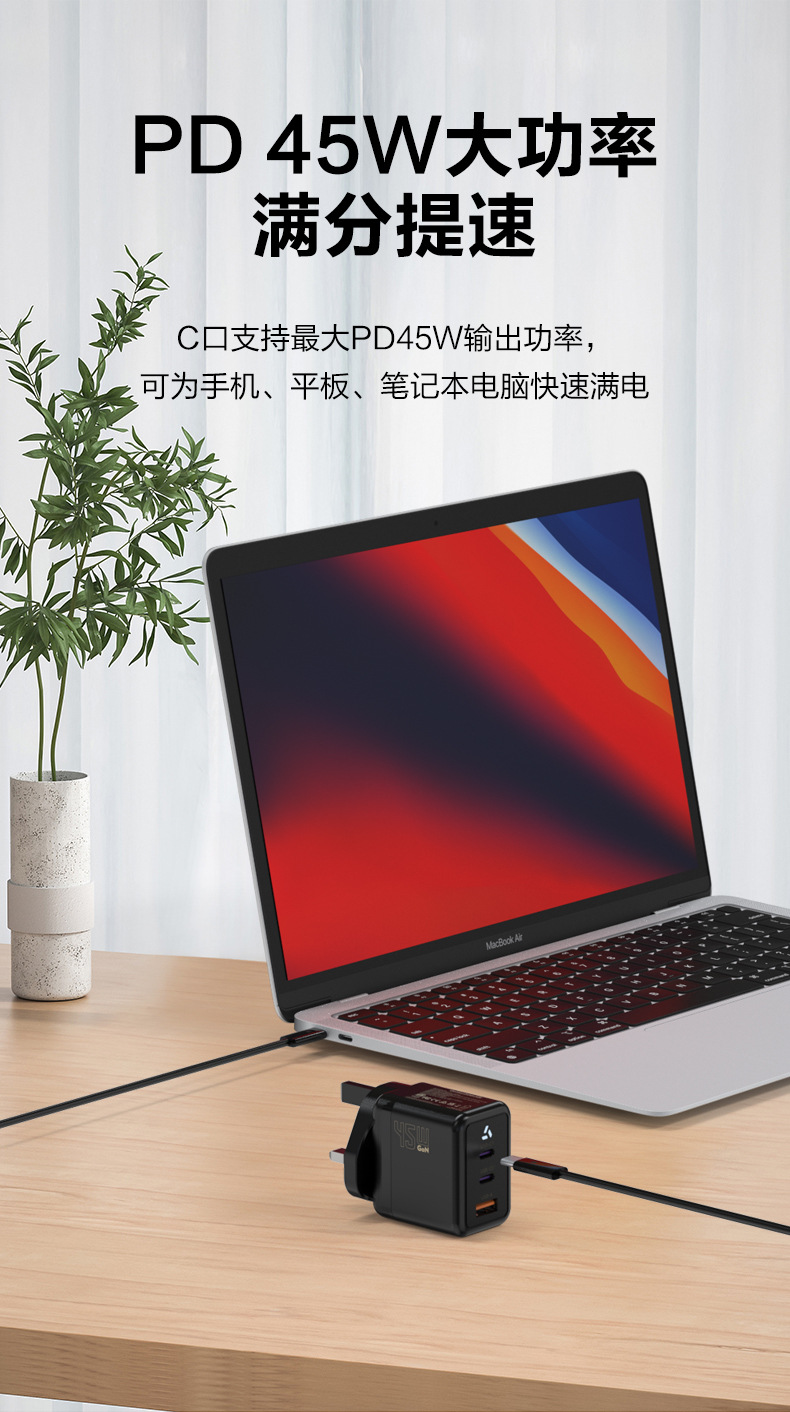 45WPD cargador de teléfono móvil multipuerto UKCA certificado computadora cabeza de carga rápida GAN adaptador de nitruro de gallio