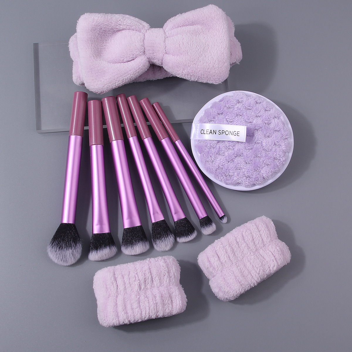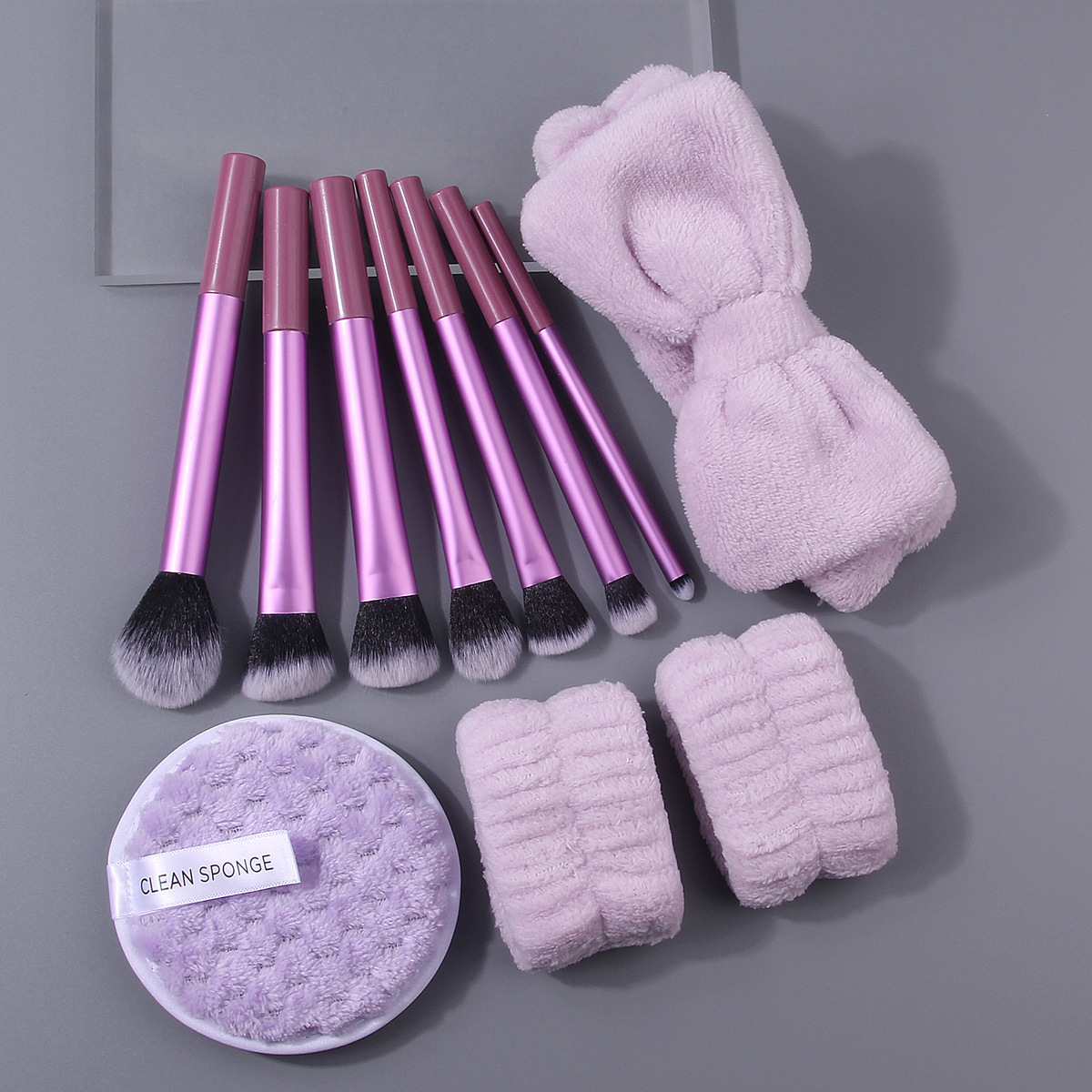 Instantemente en stock, 7 sets de cepillo de maquillaje púrpura portátil, cepillo de sombra de ojos, cepillo de piña, polvo de lavado de facial.