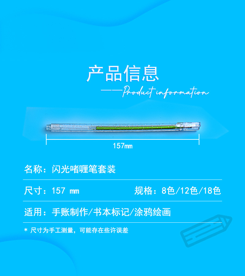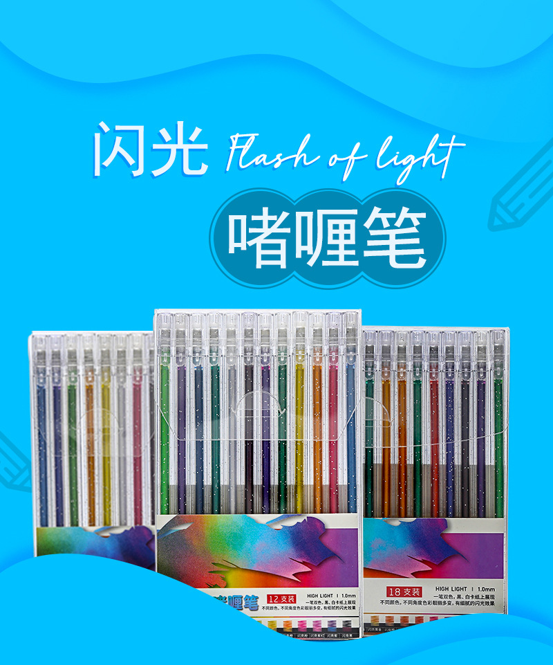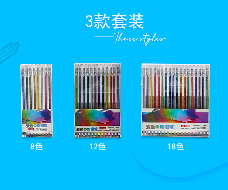 | Color de la pluma | Pen de gel de cambio de color 8 colores, Pen de gel de cambio de color 12 colores, Pen de gel de cambio de color 18 colores, Pen de gel de cambio de color 8 colores + 8 colores de núcleo, Pen de gel de cambio de color 12 colores + 12 colores de núcleo, Pen de gel de cambio de color 18 colores + 18 colores de núcleo, 8 colores de núcleo, 12 colores de núcleo, 18 colores de núcleo |